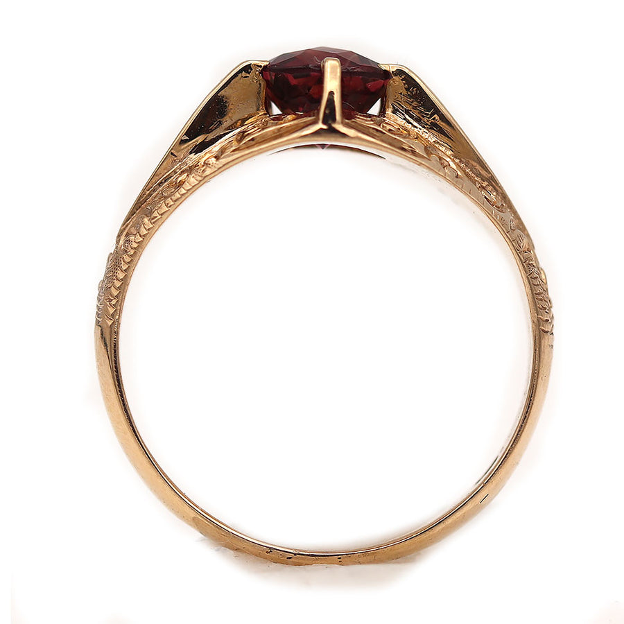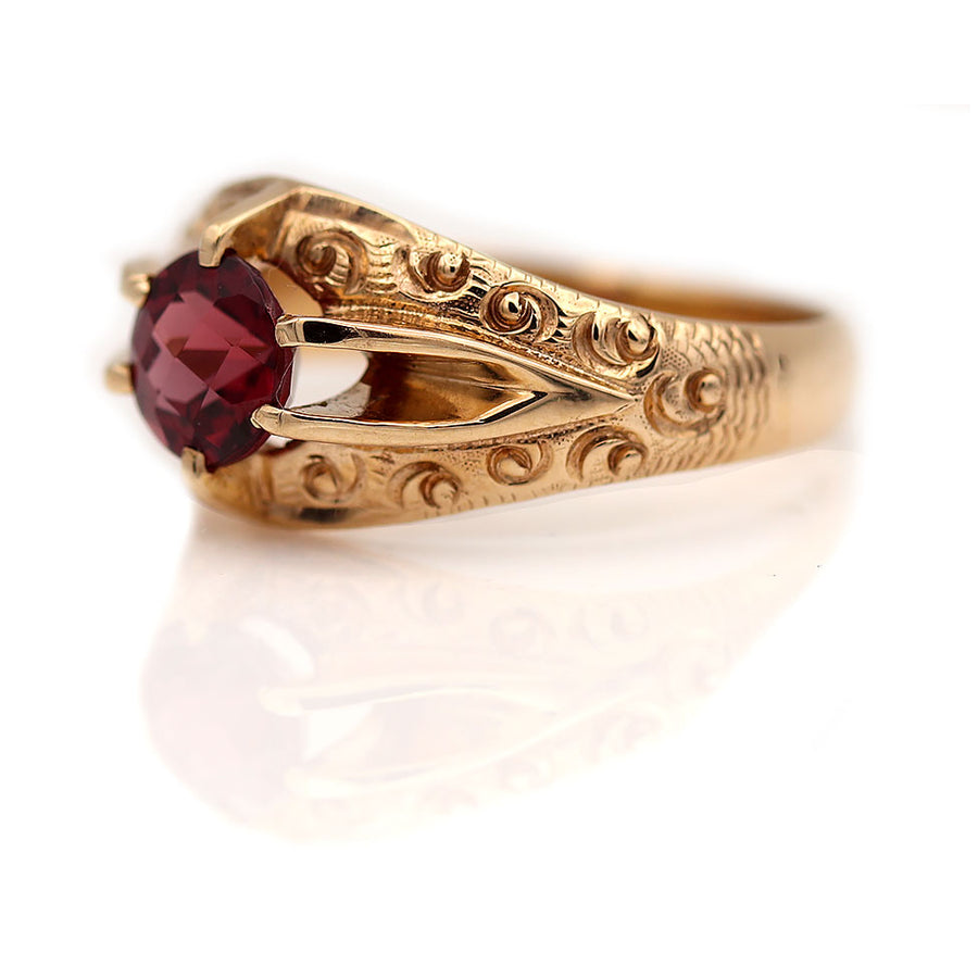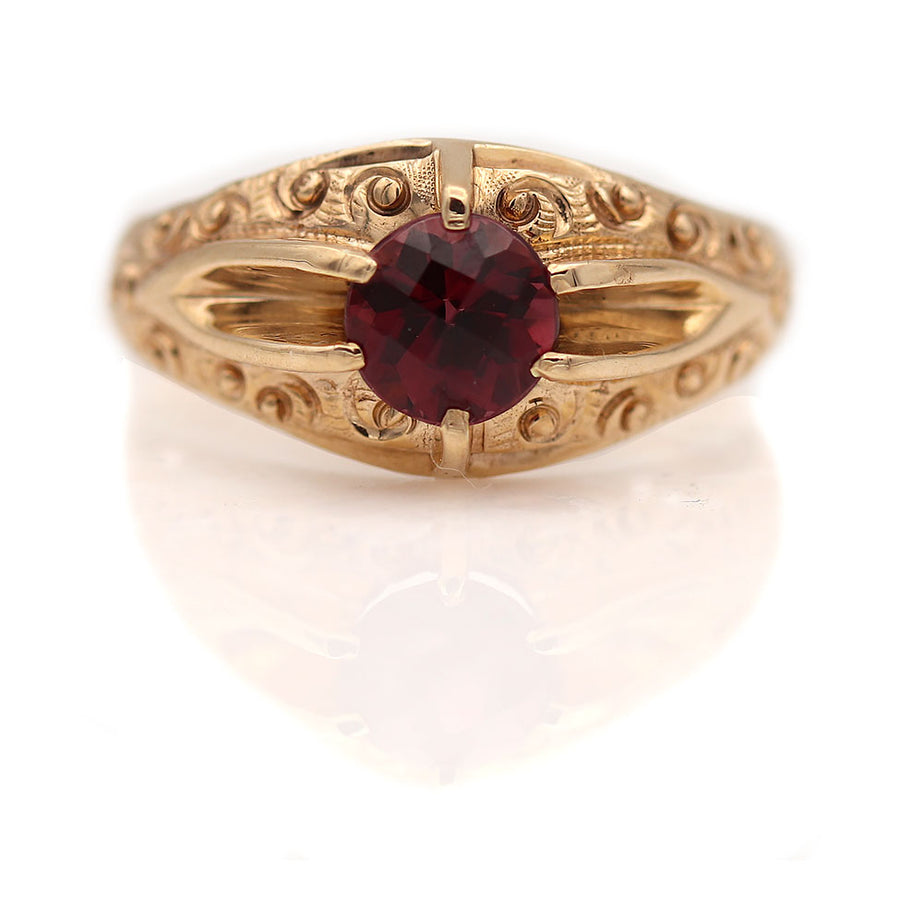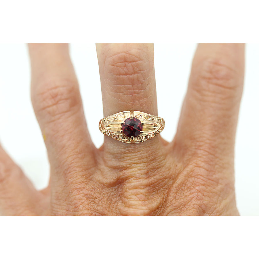 The Stenza ring is an authentic Victorian engagement ring, circa 1900s, featuring a natural, red .90 carat round cut garnet. Crafted in 10 kt rose gold and accentuated with beautiful filigree engravings, this is a lovely piece, in very good condition. A perfect alternative engagement ring!