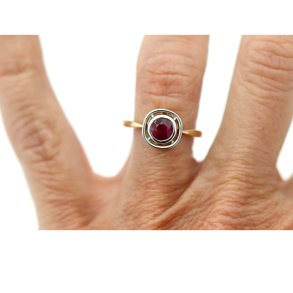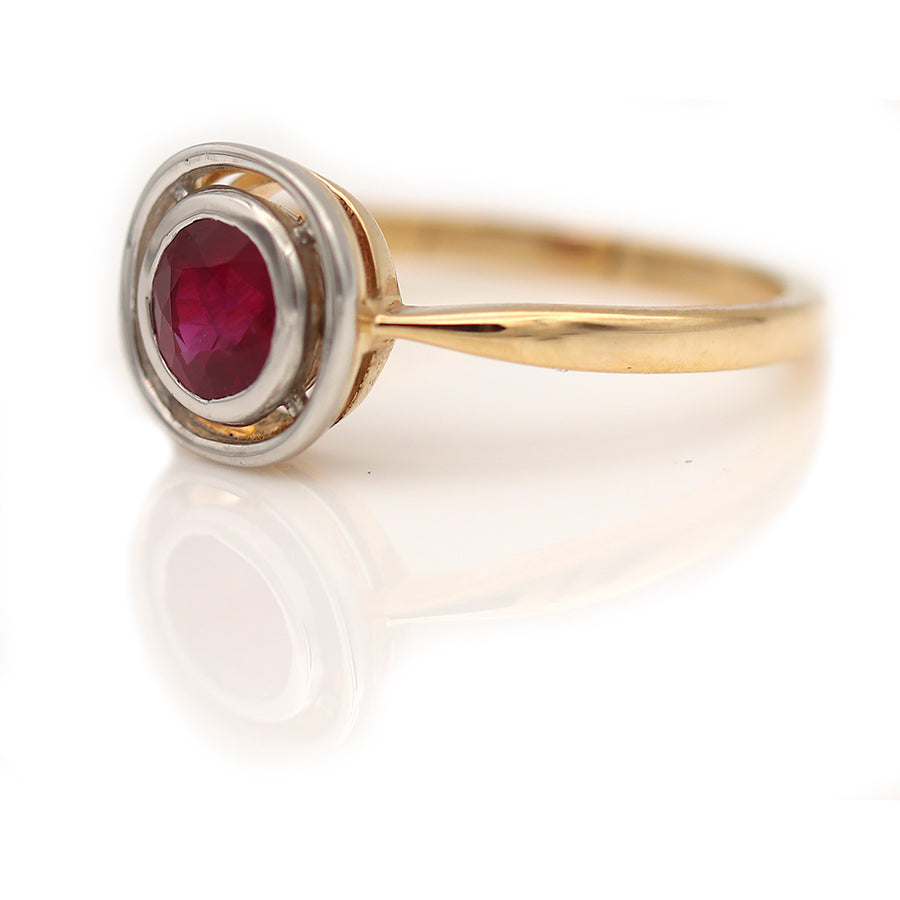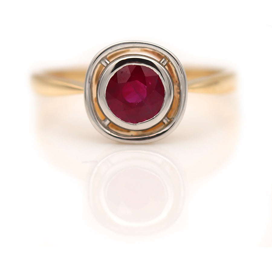 The Forever ring is a VintageDiamondRing.com made Victorian style engagement ring. The ring features an authentic 1970s .81 carat bezel set AGI certified natural round cut Burma ruby. This gemstone resides in a two-tied circular frame, beautifully crafted in recycled platinum and 18 kt yellow gold.  This ring is an exact replica of an original Victorian engagement ring we once owned. Accompanied with an AGI report stating "Moderate Gemological Evidence of Heat - Burma Origin."