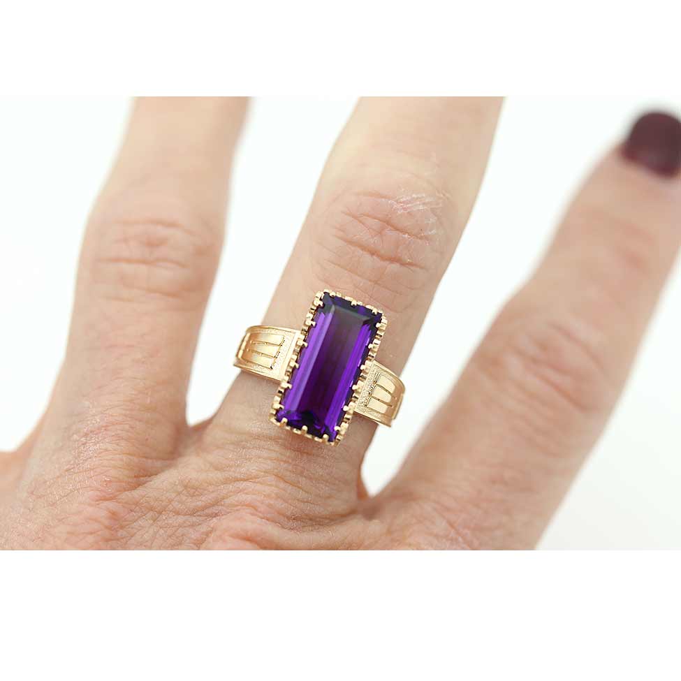 The Mcfarland ring is an Victorian-inspired VDR.com-made amethyst engagement ring using an authentic amethyst circa 1970's. The ring boasts a natural intense purple 3.01 carat rectangular cut amethyst, beautifully crafted in recycled 14 karat yellow gold, and accentuated with delicate filigree engravings. This is an exact replica of an original Victorian engagement ring we once owned. Made with love in NYC.