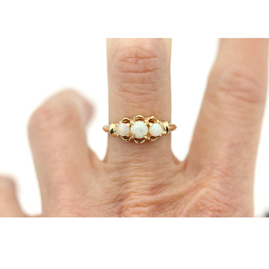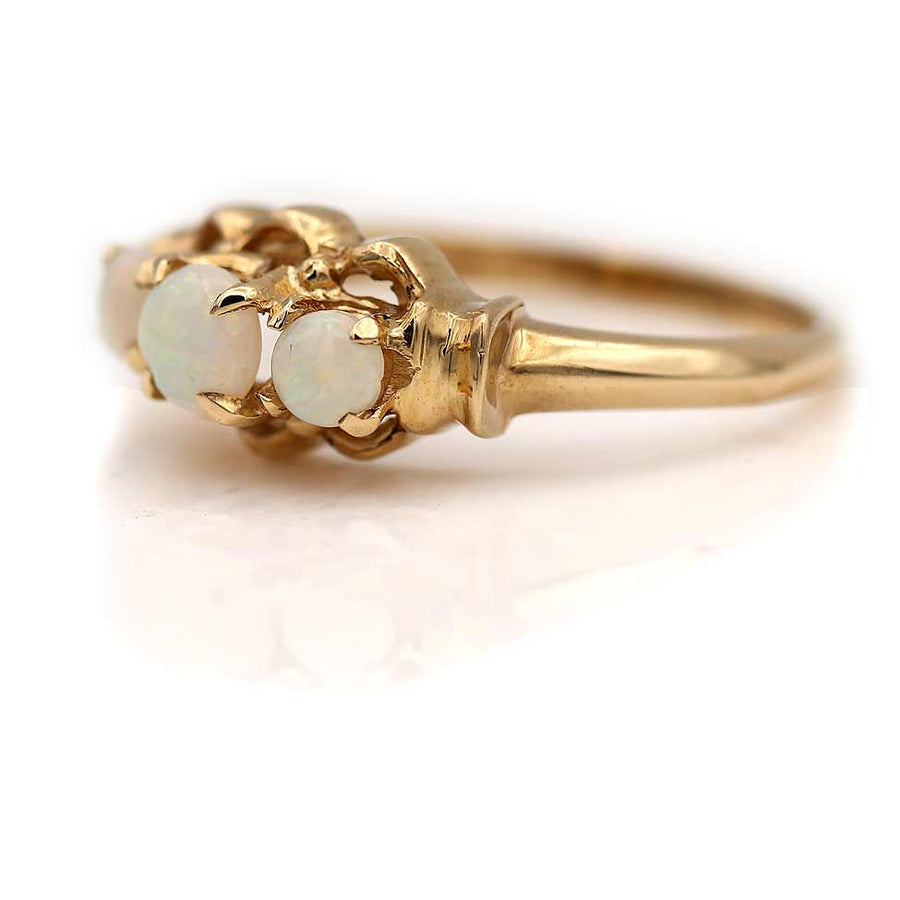 The Monaco ring is an authentic Victorian three stone engagement ring, circa 1900's, featuring three (3) natural, cabochon opals weighing approximately 1.00 carat. Beautifully crafted in 10 kt yellow gold, and accentuated with open metal work, this ring is as sweet as can be. In very good condition.