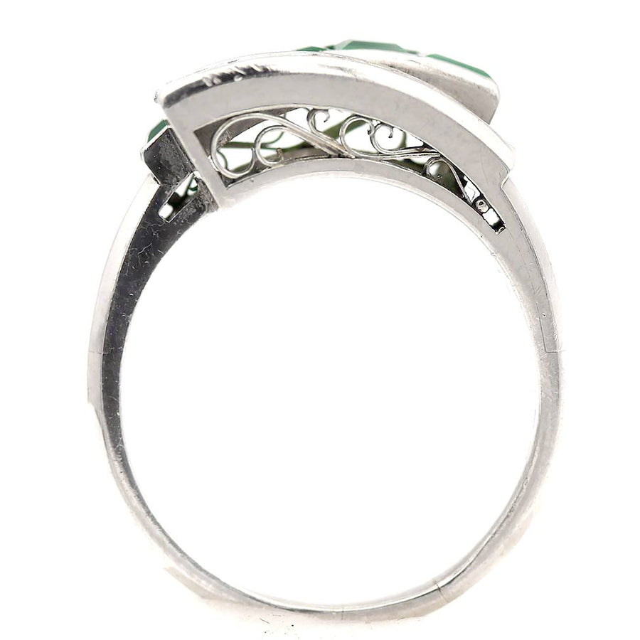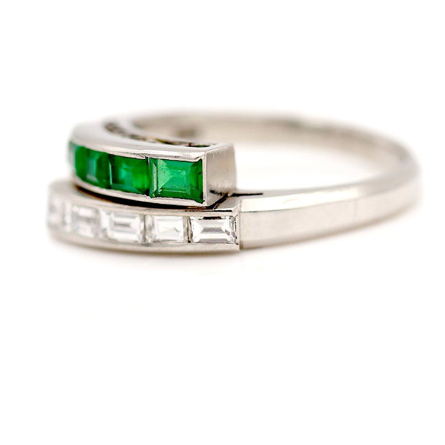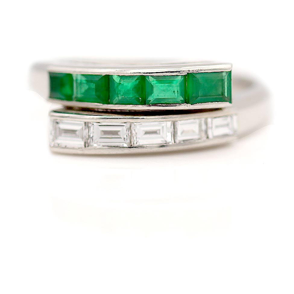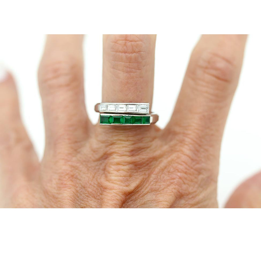 The To Be ring is an authentic vintage wedding ring, circa 1980's. This ring features five (5) natural baguette emeralds weighing .60 ctw and five (5) baguette cut diamonds weighing approximately .50 ctw. Crafted in platinum, this is the perfect ring to wear on either hand.
