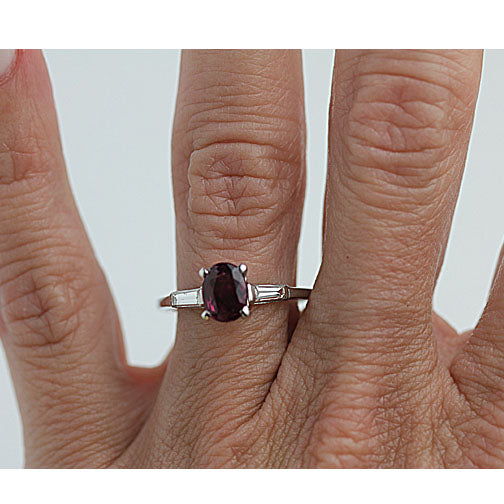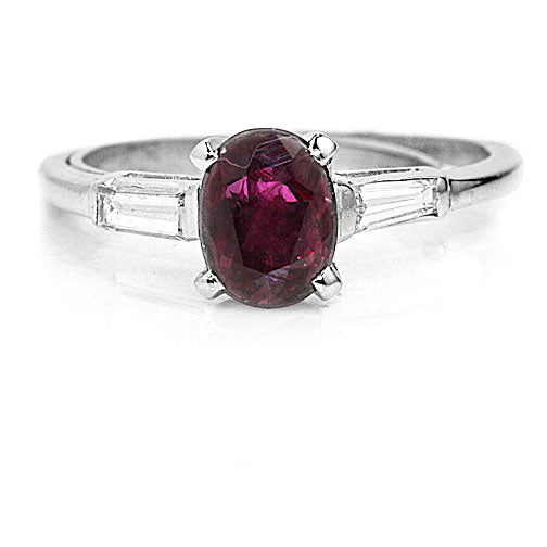 The Ronda ring is an authentic vintage engagement ring circa 1970s. The ring features a natural purplish red GIA certified 1.24 oval cut ruby. The ruby is flanked by 2 baguette cut diamond accents. Beautifully crafted in a classic 4 prong platinum three stone setting. The ruby is a beautiful shade of purplish red and in our estimation a Burma. A lovely gemstone ring with a cool vintage feel.(GIA report states purplish red with evidence of some heat treatment).