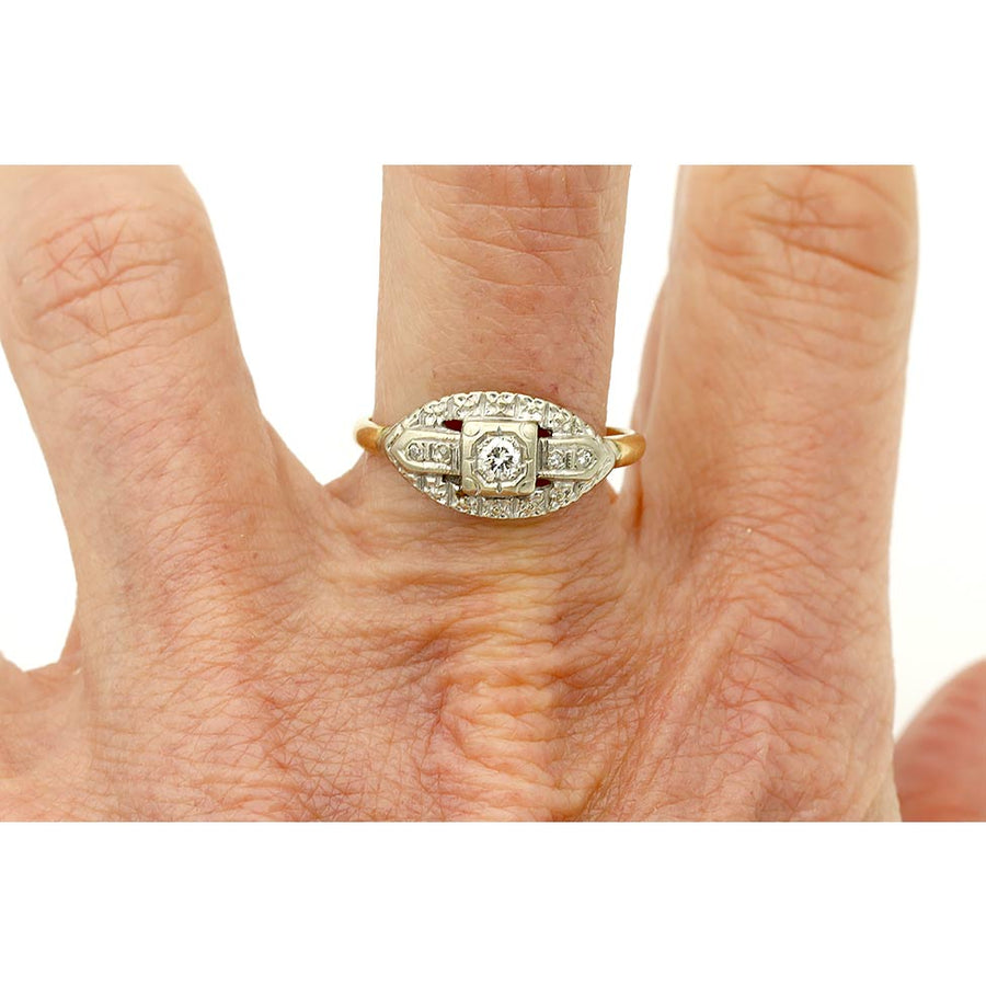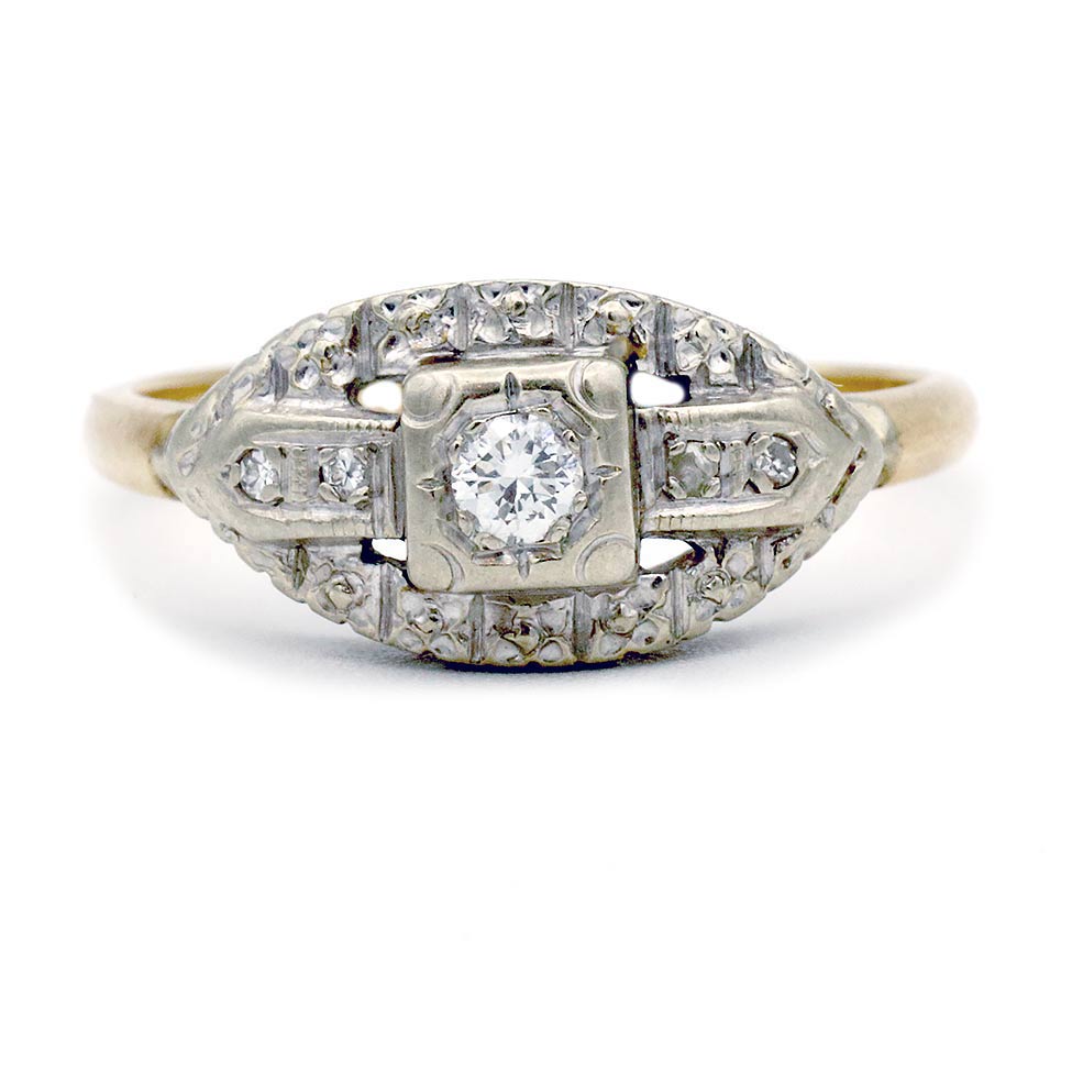 The Madison ring is an authentic vintage diamond ring circa 1940's. The ring centers a sparkling .15 carat transitional cut diamond of F color, VS2 clarity, residing in a geometric square frame. The diamond is surrounded by 14 single cut diamond accents. Crafted in 14 karat two-tone gold, white gold atop a 14 Kt yellow gold ring. Perfect to wear with other vintage bands. In good condition.