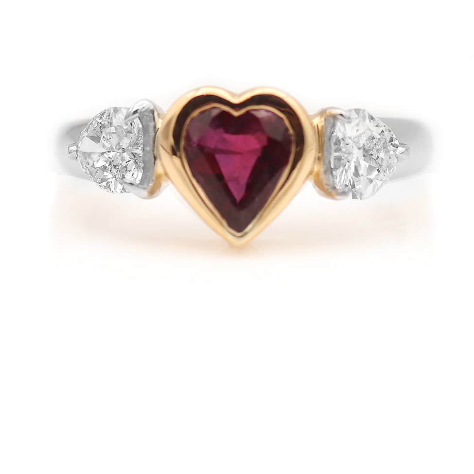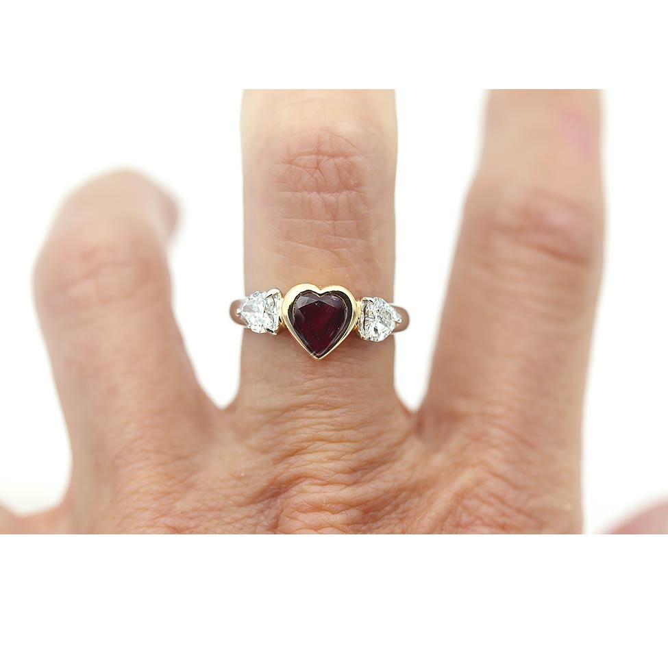 The Braufmann ring is a vintage inspired VDR.com made engagement ring using an authentic 1970's 1.12 carat GIA certified, bezel set, natural heart shape ruby with heat, flanked by two heart shaped diamonds weighing 1.01 ctw. Crafted in a recycled platinum and 18 kt yellow gold setting. Perfect in every way. Made with love in NYC!