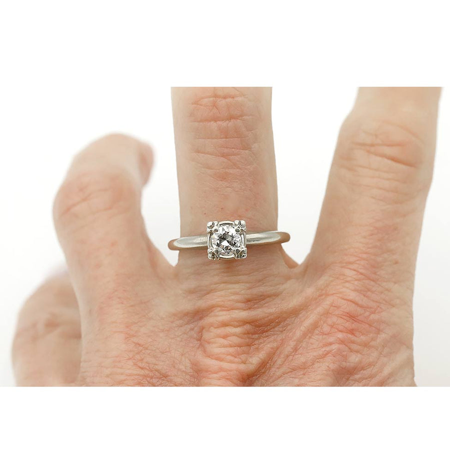 The Marianne ring is an authentic antique diamond ring circa 1940's. The ring features a beaming .45 carat AGI certified old European cut diamond of F color, VS2 clarity. The diamond sits beautifully in a classic solitaire ring with fishtail prongs. Crafted in 14 karat white gold. A delicate, consummate vintage ring with the perfect amount of patina. In very good condition.