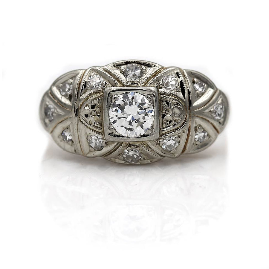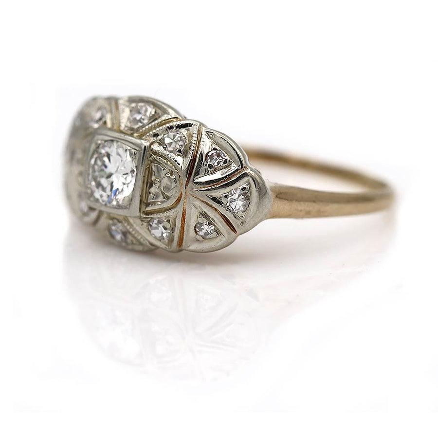 The Abba ring is an authentic vintage dome ring circa 1940's. The ring features a bright white .30 carat old transitional cut diamond of F color, VS1 clarity, residing within a geometric square frame. The diamond is surrounded by 12 single cut diamonds accents. This distinctive ring was crafted in 14 karat white gold atop a 14 karat yellow gold ring. A dynamic vintage ring, in pristine condition.