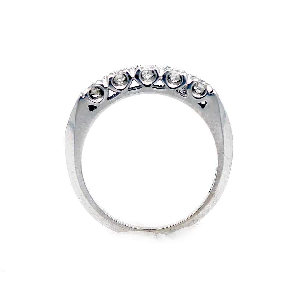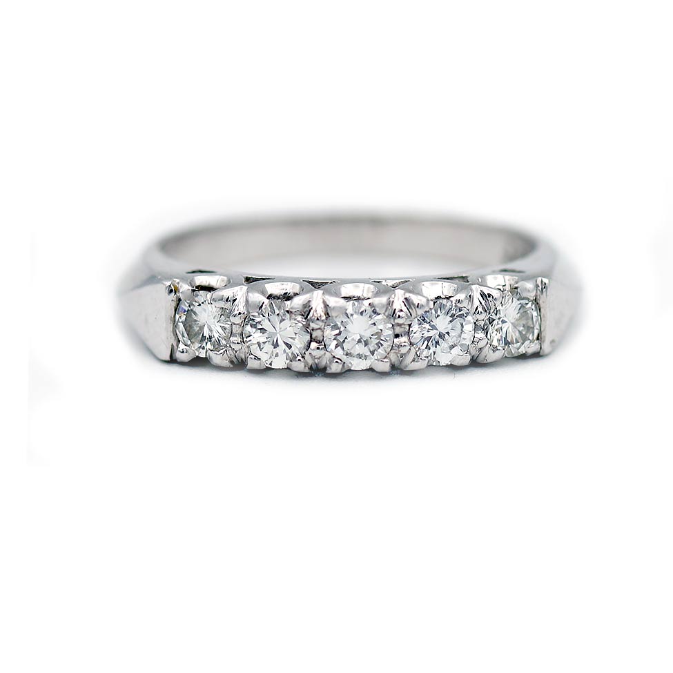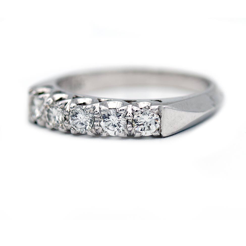 Mya is a classic vintage wedding wedding ring featuring 5 bright-white transitional cut diamonds weighing .65 carat (G color, VS2 clarity). Crafted in 14 kt white gold. Perfect to wear on either hand or to stack with your favorite vintage engagement ring. In excellent condition.