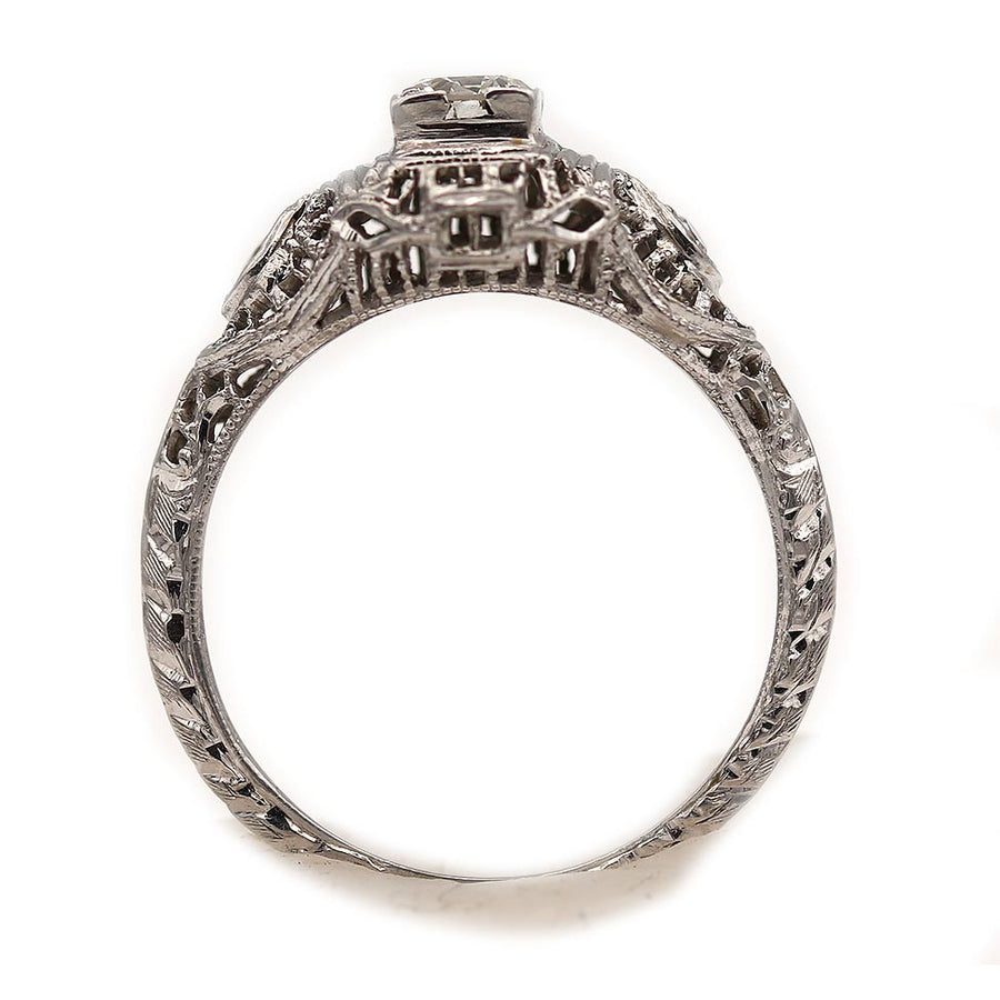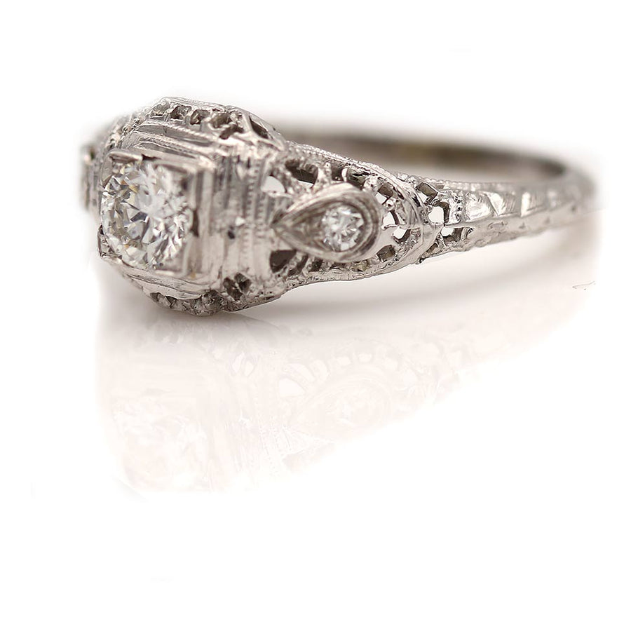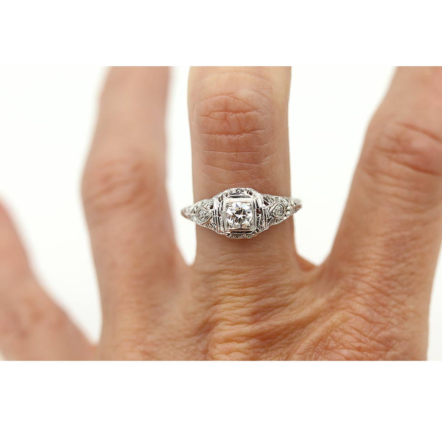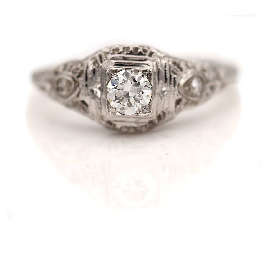 The Cotton ring is an authentic vintage engagement ring from the Art Deco era, circa 1930s. This ring showcases a .30 carat old European cut diamond of G color and SI1 clarity residing within a geometric square frame, and flanked by two (2) single cut diamond accents. Beautifully crafted in 18 kt white gold, accentuated with open metal work, filigree and milgrain engravings. A sweet Art Deco ring, in very good condition.