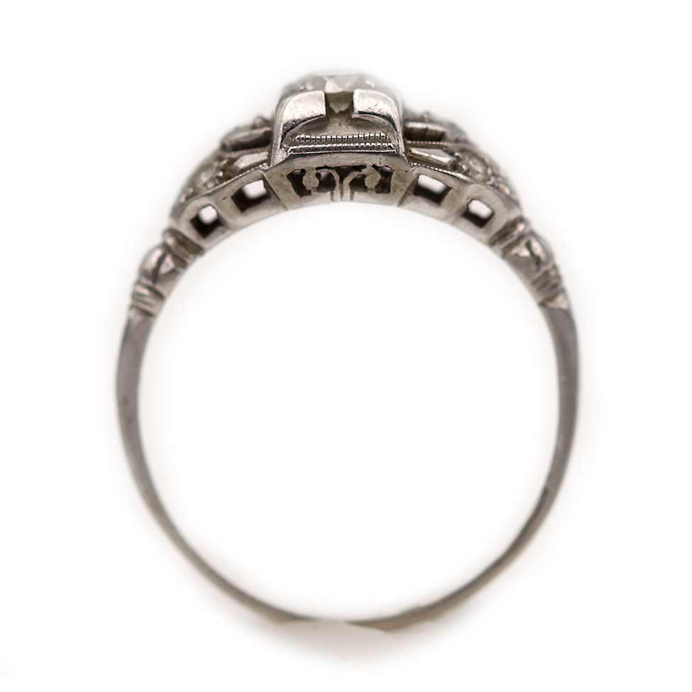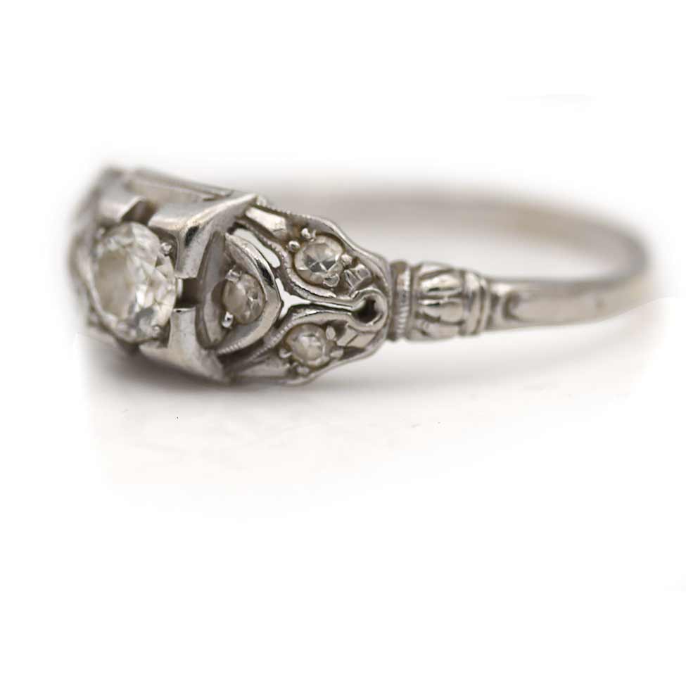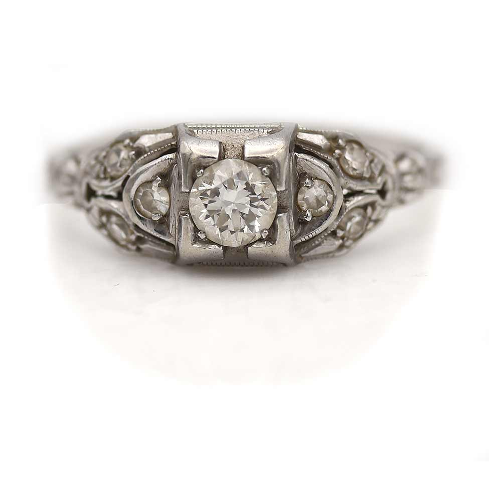 The Galway ring is an authentic vintage engagement ring circa 1930s. This ring features a bright-white old old European cut diamond weighing .25 carat (H color and SI1 clarity), residing within a geometric square frame, and flanked by six (6) single cut diamond accents. Beautifully crafted in 14 kt white gold, and accentuated with delicate milgrain engravings, this is a sweet vintage piece. In good condition.