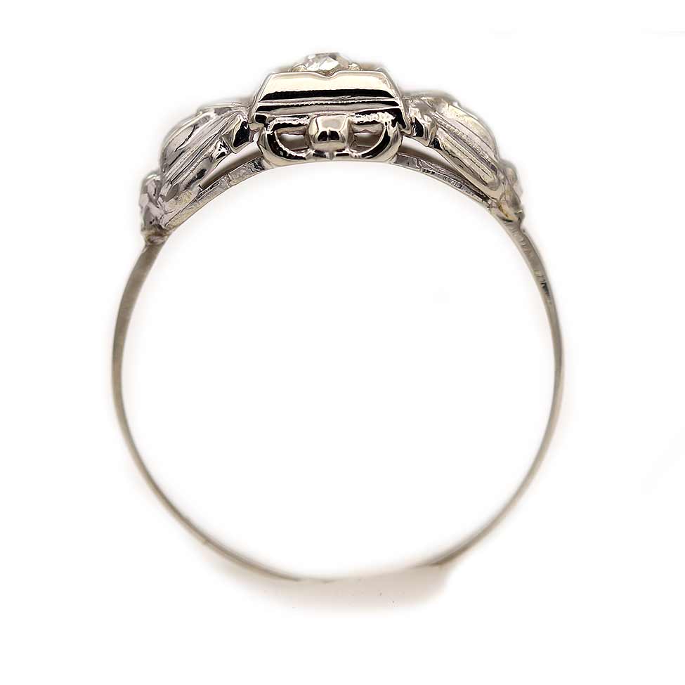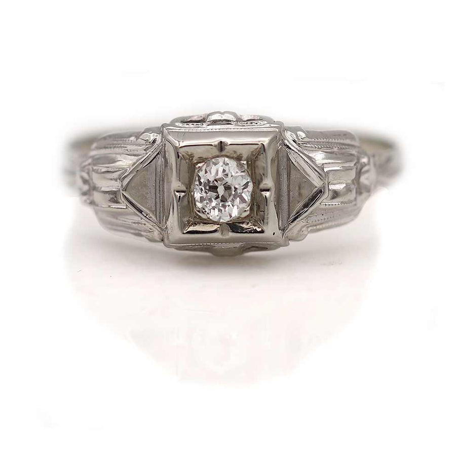 The Jerome ring is an authentic vintage engagement ring, circa 1940s, featuring a bright-white old mine cut diamond (weighing .20 carat with G color and VS2 clarity), residing within a geometric square frame. Beautifully crafted in 14 kt white gold, and accentuated with delicate filigree and milgrain engravings, this is a sweet vintage piece. In very good condition.