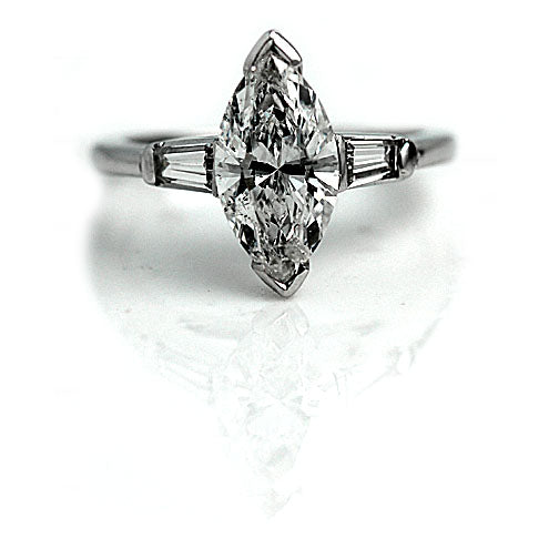 The Sibel ring is an authentic vintage three stone engagement ring circa 1970's. The ring showcases a dazzling .60 carat GIA certified marquis diamond of D color, SI1 clarity. The diamond is flanked by 2 tapered baguette diamond accents. Crafted 14 karat white gold. A consummate vintage ring. Slender, timeless and in pristine condition.