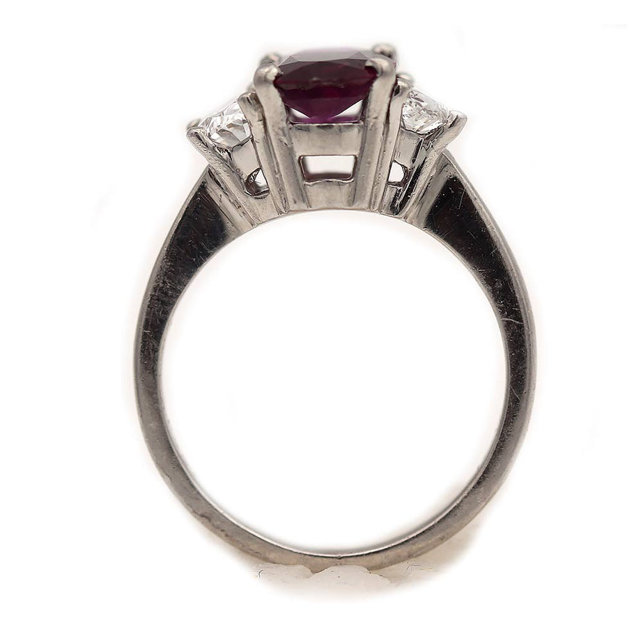 The Cole ring is an authentic vintage engagement ring circa 1980s. This ring features an approximate 2.50 carat natural pink-purple oval cut sapphire accompanied by a GIA certificate stating natural corundum with heat treatment. This beautiful sapphire is flanked by two half moon cut diamonds, weighing approximately .80 ctw. Beautifully crafted in platinum, this is a beautiful gemstone engagement ring. Magnifique. In very good condition.