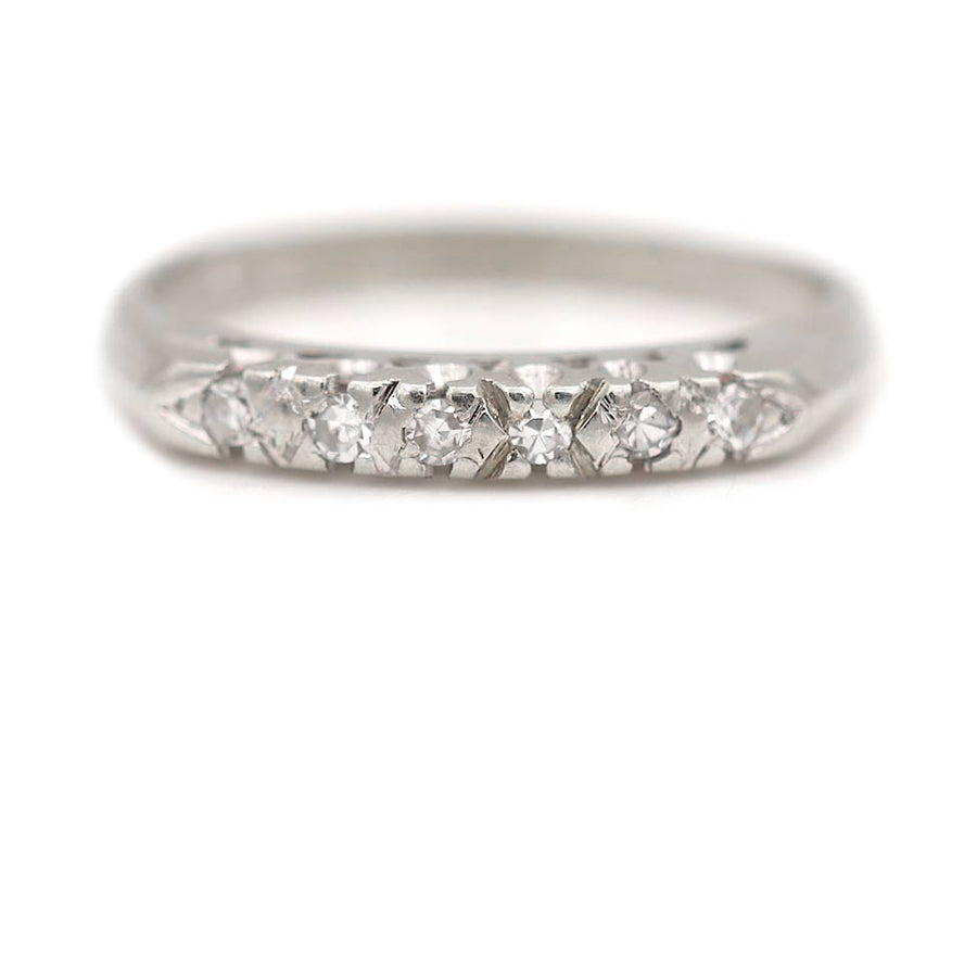 Manee is a classic vintage wedding band featuring 6 glittering single cut diamonds, weighing .15 carat with H color and VS2 clarity. Crafted in 14 kt white gold, in the 1950's, this is the perfect band to stack with other vintage wedding bands or to wear with your vintage engagement ring. In very good condition. The band measures 2.6 wide tapering to 2.5 and .85 at the bottom.