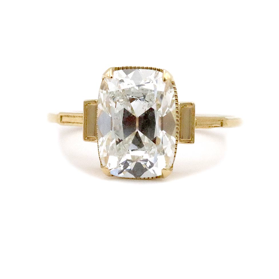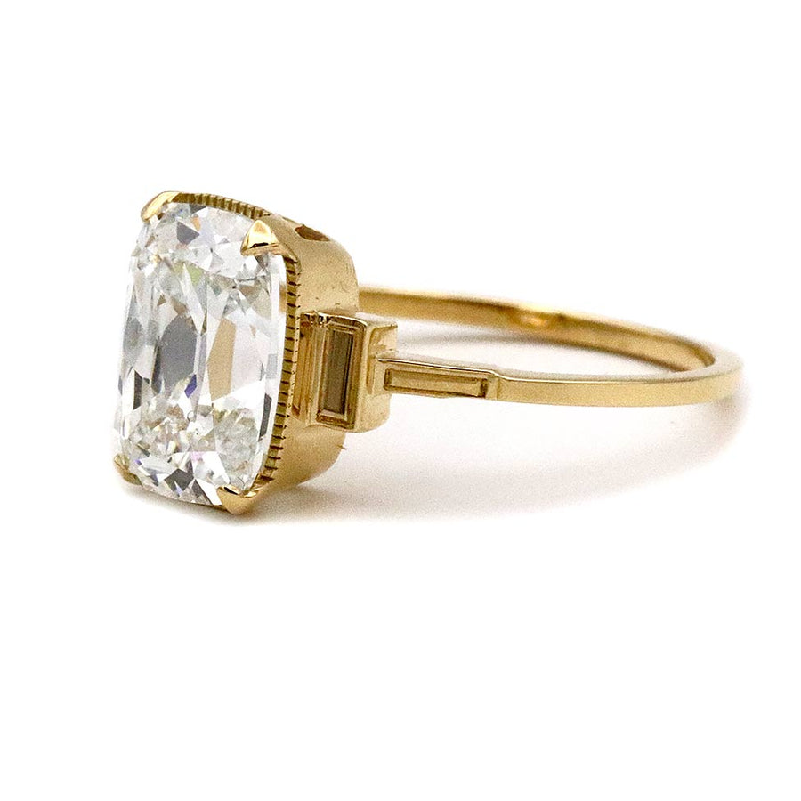 The Wella ring is a vintage-style engagement ring featuring a dazzling and icy-white 2.81 carat old mine lab grown cushion cut diamond, accompanied with an IGI certificate stating E color and VS1 clarity. Beautifully crafted in 18K yellow gold, the band is adorned with detailed filigree engravings. This ring is an exact replica of a vintage piece we once owned. Magnifique! This cushion cut diamond is Lab Grown!