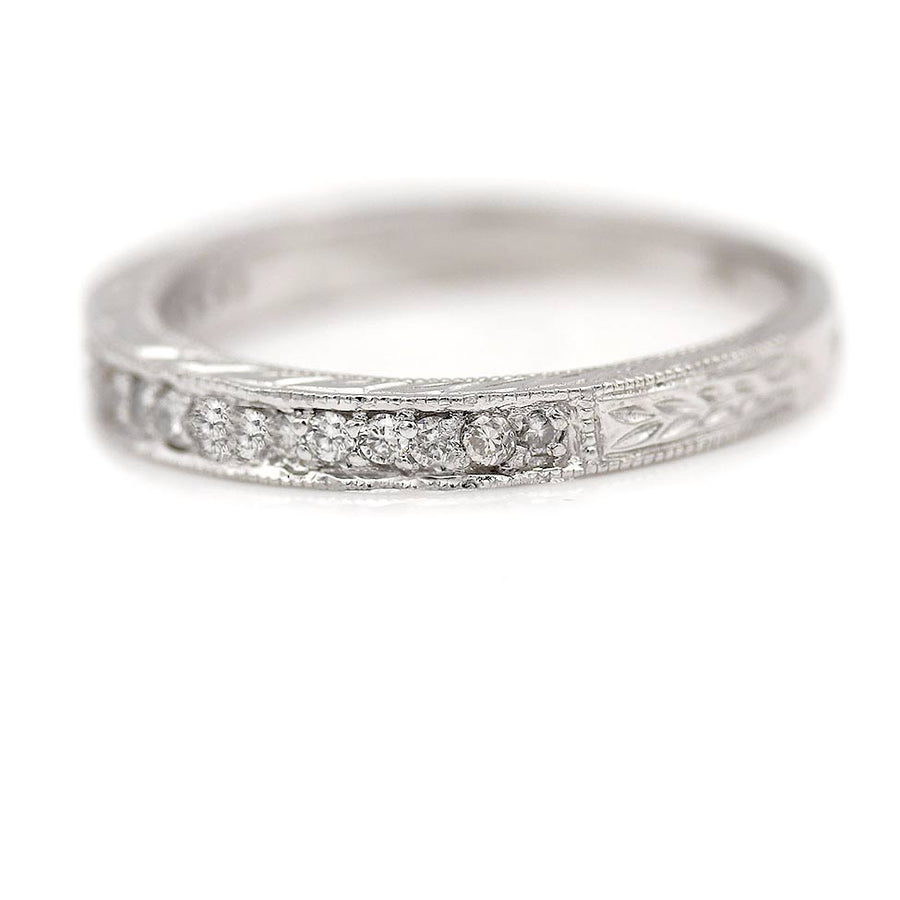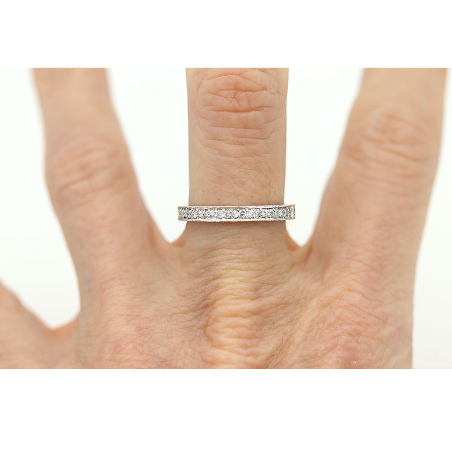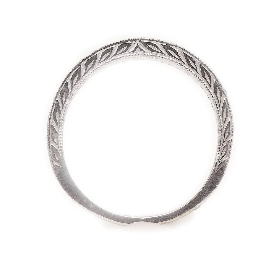 Joana is a vintage style wedding band, circa 1980's, featuring twenty (20) prong set round cut diamonds, with G color and SI1 clarity weighing approximately .20 carat. Crafted in in 14 kt white gold, and accentuated with filigree engravings, this is the perfect complement for your vintage engagement ring.