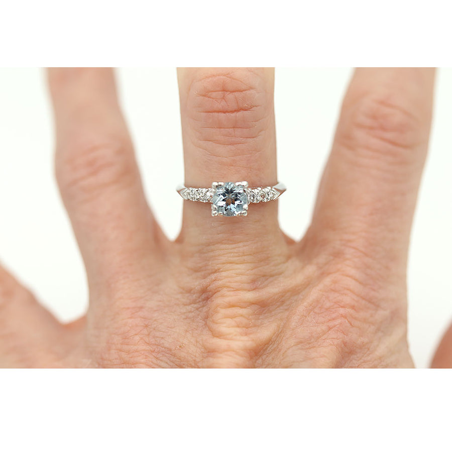 The Holiday ring is an authentic vintage aquamarine engagement ring, circa 1960's. This ring features a natural placid blue .95 carat round cut aquamarine, flanked by six (6) single cut diamond accents. Beautifully crafted in platinum, this ring is in very good condition. As sweet as can be! The perfect non-diamond engagement ring!