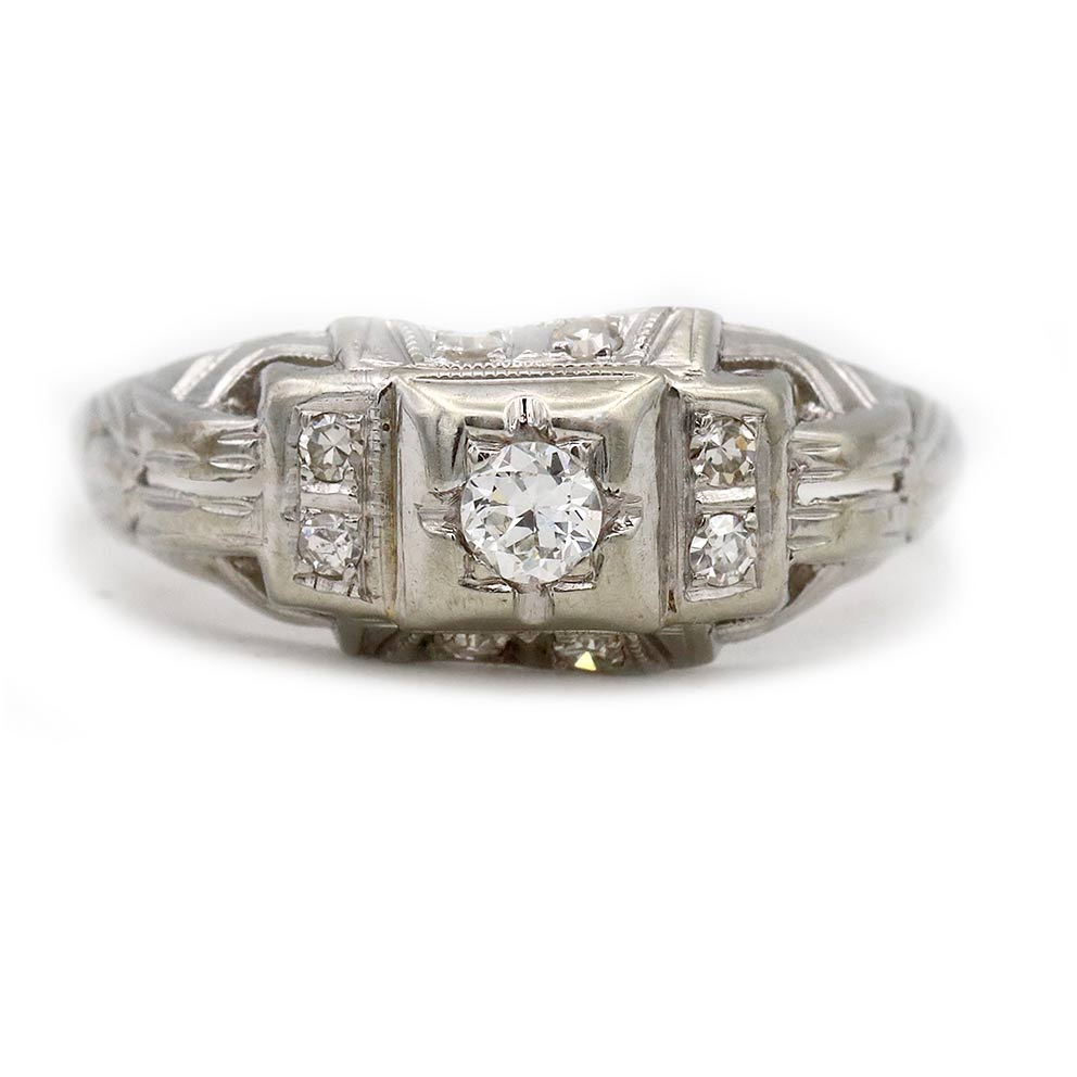 The Jenna ring is an authentic antique engagement ring from the Art Deco era circa 1930's. The ring features a glittering .15 carat old European cut diamond of F color, VS2 clarity, residing in a geometric square frame. The diamond is flanked by 8 single cut diamond accents. Crafted in 14 kt white gold, completed with milgrain and delicate engravings. Timeless, classic and in very good condition.