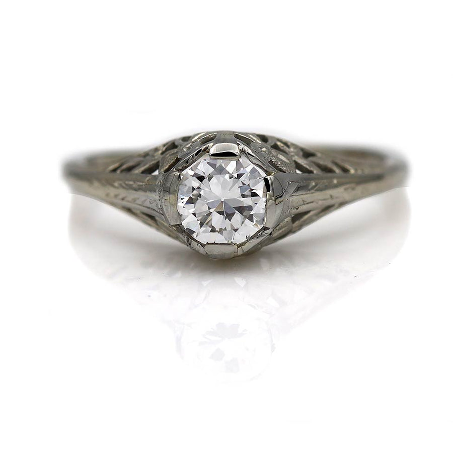 The Jubilo ring is an authentic vintage engagement ring from the Art Deco era, circa 1930s featuring a GIA certified .50 carat old European cut diamond stating F color and SI2 clarity. Beautifully crafted in 18 kt white gold and accentuated with open metal work and intricate floral engravings. A lovely vintage treasure with beautiful detailing. In very good condition. Signed/stamped "Belais."
