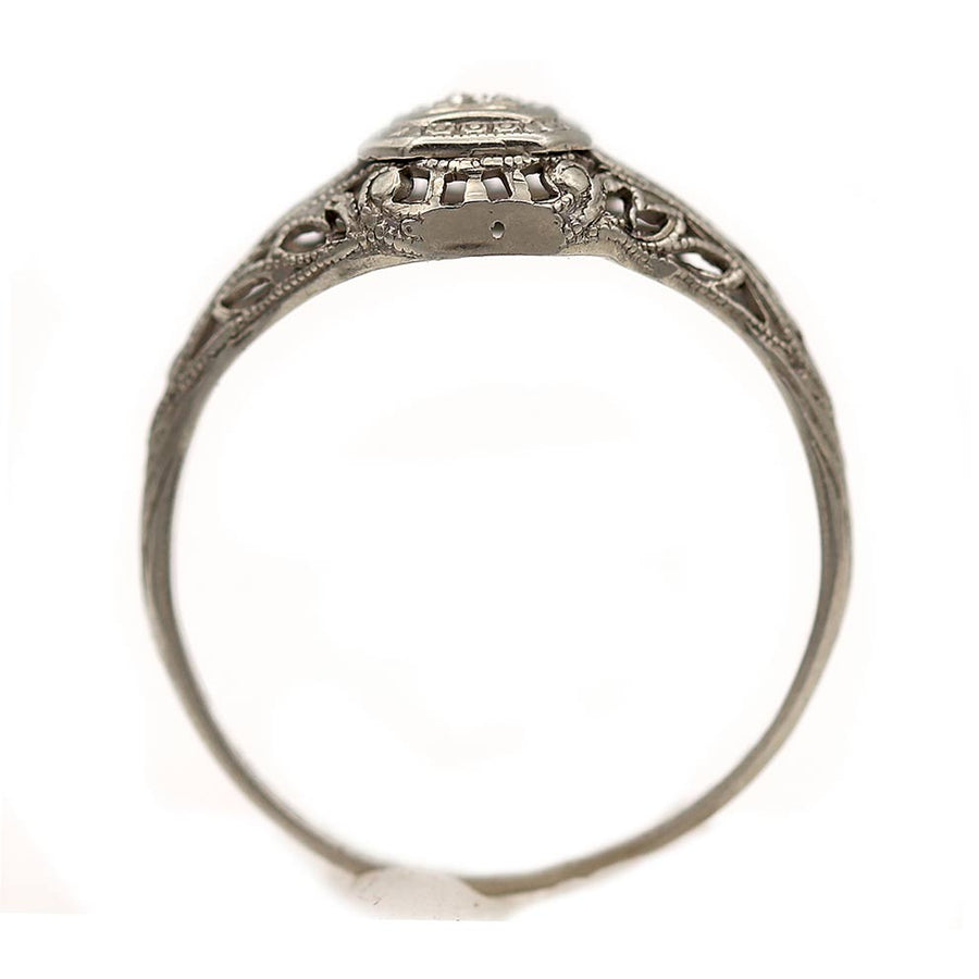 The Gracie ring is an authentic vintage engagement ring from the Art Deco era circa 1920s. The ring features a .08 old European cut diamond of F color, VS2 clarity, residing in a two tiered geometric octagonal frame. Crafted in 18 karat white gold, completed with open metal work and filigree engravings. We adore this timeless and original Art Deco ring. They don't come any finer. In very good condition.