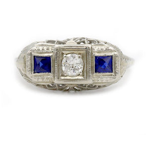 Art Deco .30 CTW Three Stone Diamond Sapphire Vintage Engagement Ring
