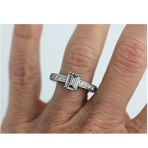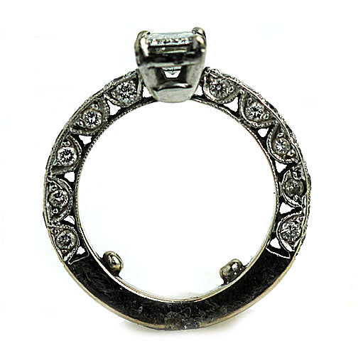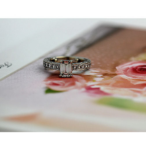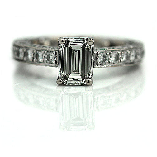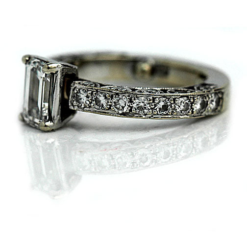Art deco replica ring contains a center emerald cut diamond weighing exactly 1.09 carat with GIA report stating K color and VS2 clarity (this mounting can fit up to a 1.25 carat emerald cut diamond). Crafted in 14 kt white gold, with a sweet art deco filigree design, this diamond is flanked by thirty six shimmering round diamond accents weighing approximately 2.20 carat. This is an exact copy of an art deco engagement ring.