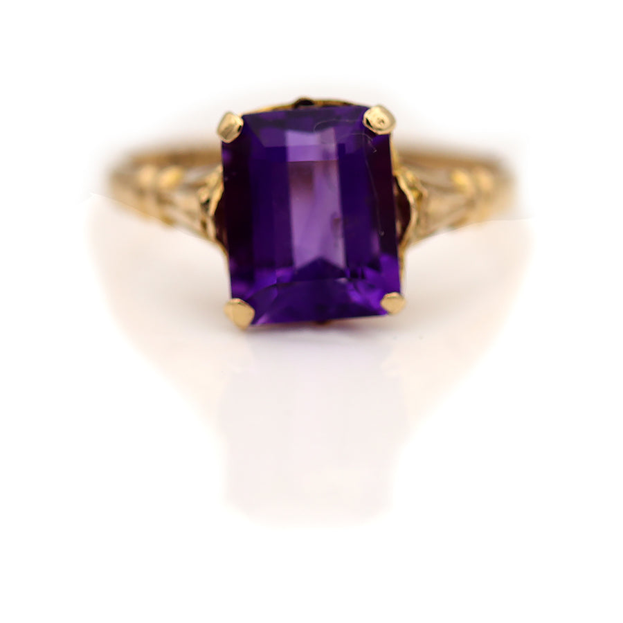 The Wiley ring is an authentic Victorian amethyst engagement ring, circa 1900s. This ring features a natural deep purple emerald cut amethyst weighing approximately 1.50 carat. Beautifully crafted in 10 kt yellow gold, accentuated with delicate filigree engravings. A sweet alternative jewel from the Victorian era. In very good condition.