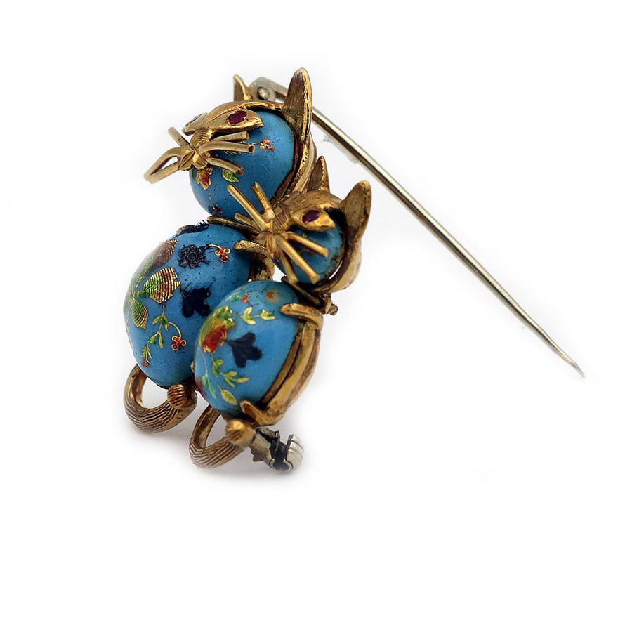 18 Kt Yellow Gold Ruby and Enamel Twin Cat Brooch