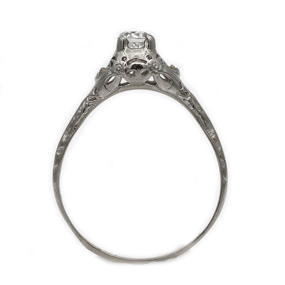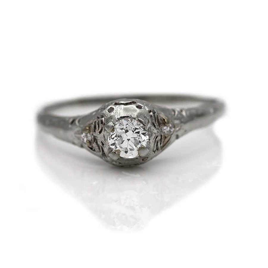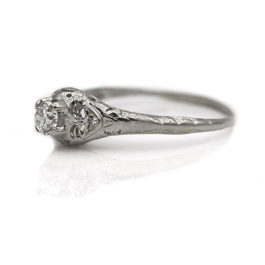 The Sylva ring is an authentic vintage engagement ring from the Art Deco era circa 1920’s. The ring showcases a dazzling .40 carat AGI certified old European diamond of I color, VS2 clarity. Beautifully crafted in 14 karat white gold, accentuated with intricate filigree engravings. A timeless piece, in very good condition.