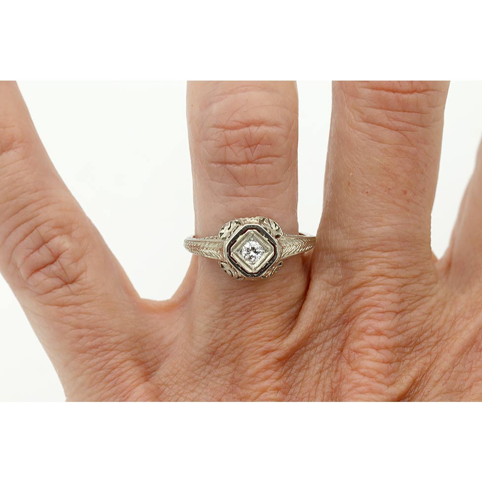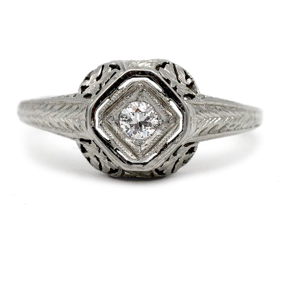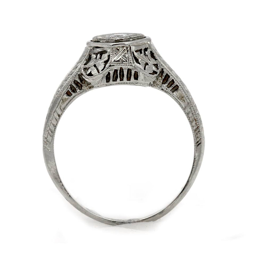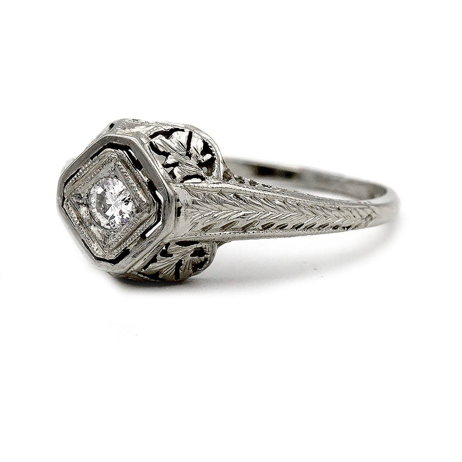 The Eliza ring is an authentic vintage engagement ring from the Art Deco era circa 1920s. The ring features a .15 carat old European-cut diamond of G color, VS2 clarity. The diamond radiates solo from within a floating, two-tiered hexagonal setting. Crafted in 18 karat white gold, completed with filigree engravings. A beautiful vintage ring with intricate engravings. Delicate, lovely and in pristine condition.