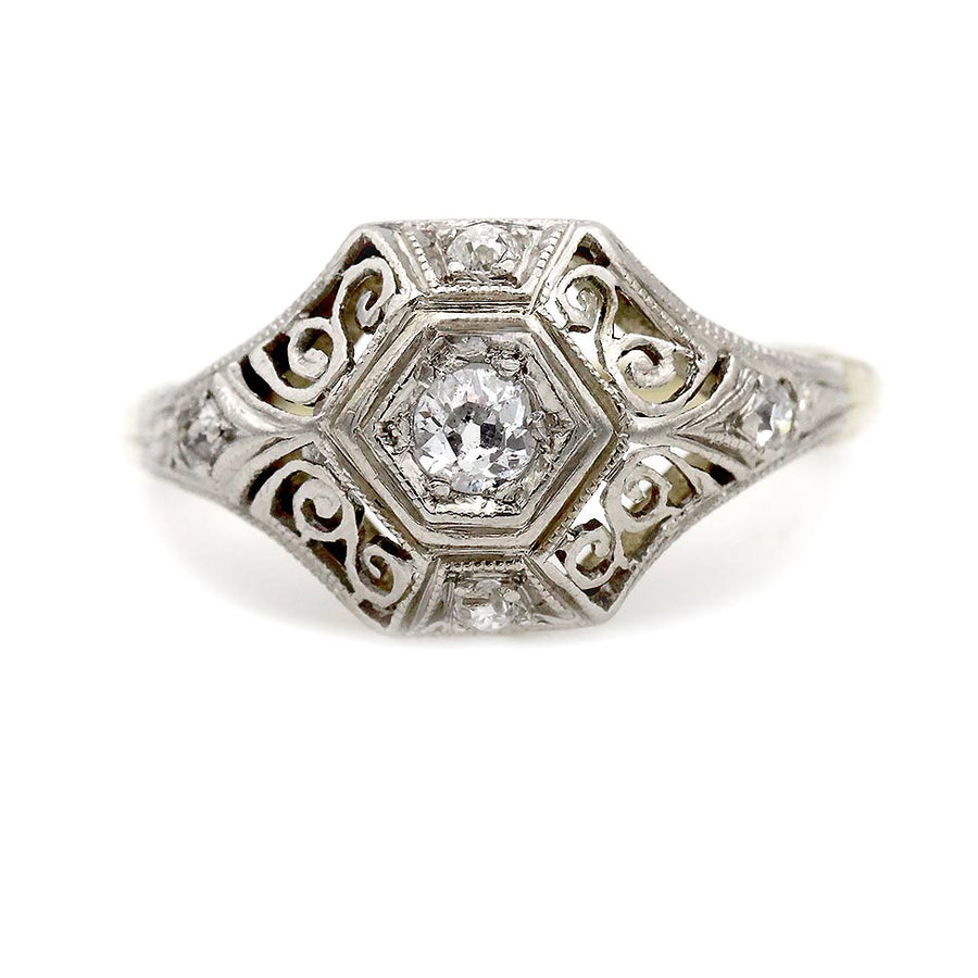 The Finestra ring is an authentic vintage diamond engagement ring from the Art Deco era, circa 1930s. This ring showcases a .15 carat old mine cut diamond of F color and SI2 clarity residing within a geometric hexagonal frame, and flanked by four (4) old mine cut diamond accents. Beautifully crafted in 14 kt two-tone gold, accentuated with delicate filigree engravings and swirls of open metal work. A gorgeous vintage piece in good condition.