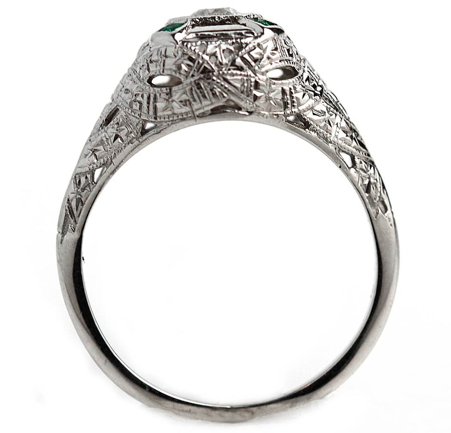 The Missi ring is an authentic antique engagement ring from the Art Deco era circa 1930s. The ring boasts a .20 carat old mine cut diamond of J color, SI1 clarity, residing in a geometric octagonal milgrain frame. The diamond is surrounded 4 synthetic bezel set square cut emeralds. Crafted in 18 karat white gold, accentuated with open metal work and intricate filigree engravings. A lovely, vibrant Art Deco ring with a gorgeous pop of color. In very good condition.