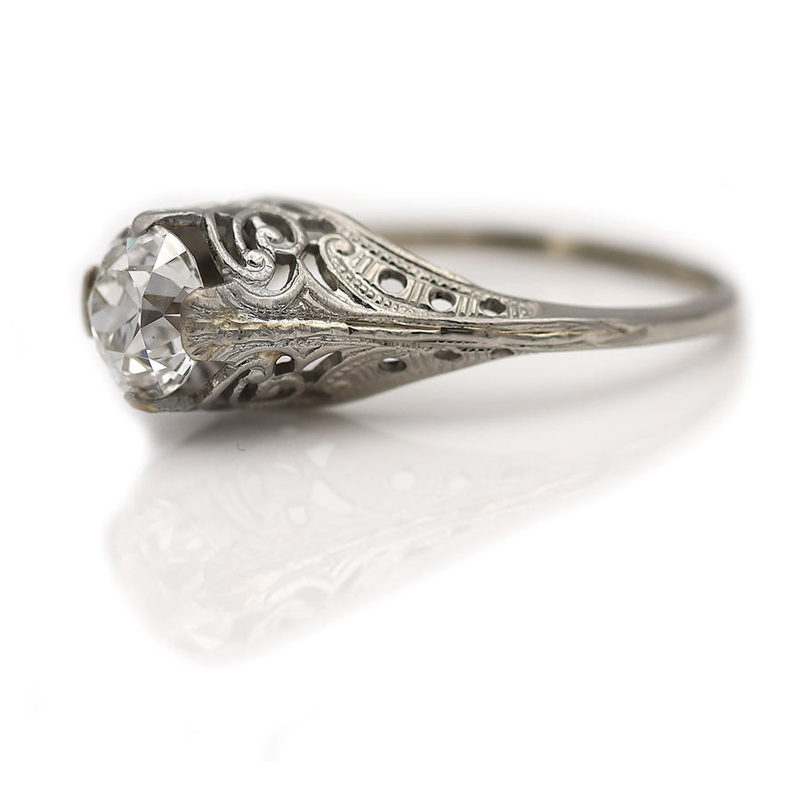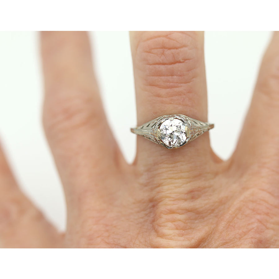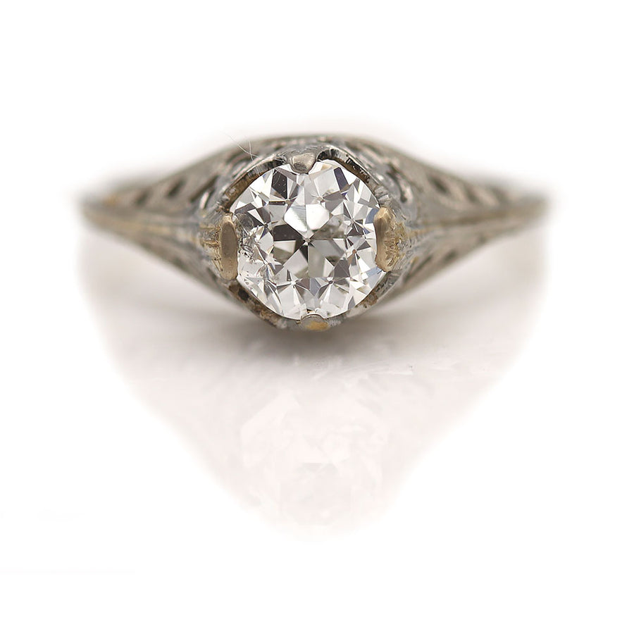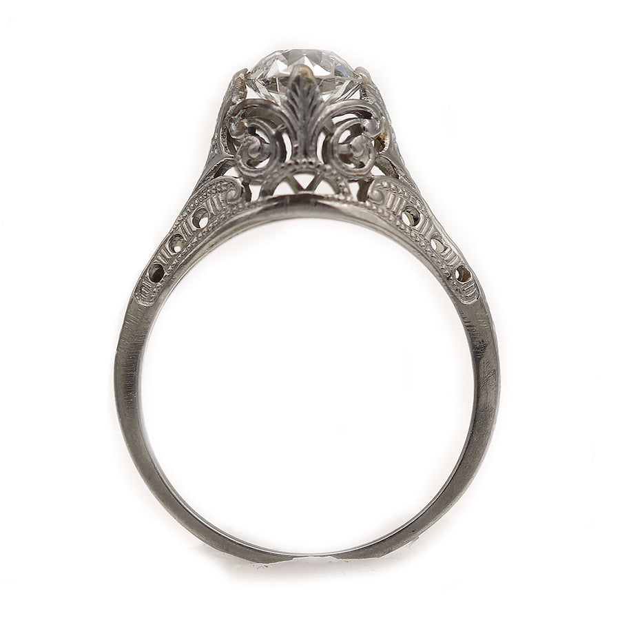 The Irina ring is an authentic Art Deco solitaire engagement ring circa 1930's. The ring showcases a GIA certified 1.02 carat old European cut diamond of H color, I1 clarity. Beautifully crafted in 18 karat white gold, accentuated with intricate swirls of metal work and filigree engravings. A vintage masterpiece with the perfect amount of patina. In very good condition.