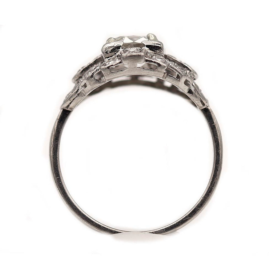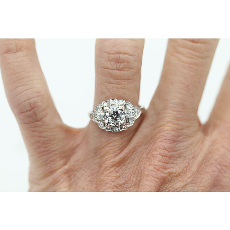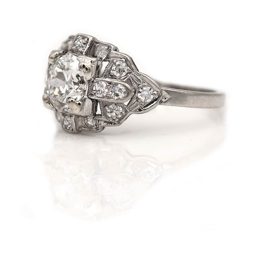 The Melene ring is an authentic vintage engagement ring from the Art Deco era, circa 1930s. This ring features a GIA certified .95 carat old European cut diamond of I color and I1 clarity, surrounded by sixteen (16) single cut diamonds weighing .50 carat. Beautifully crafted in platinum and accentuated with delicate milgrain engravings, this is a sweet vintage ring, in very good condition.