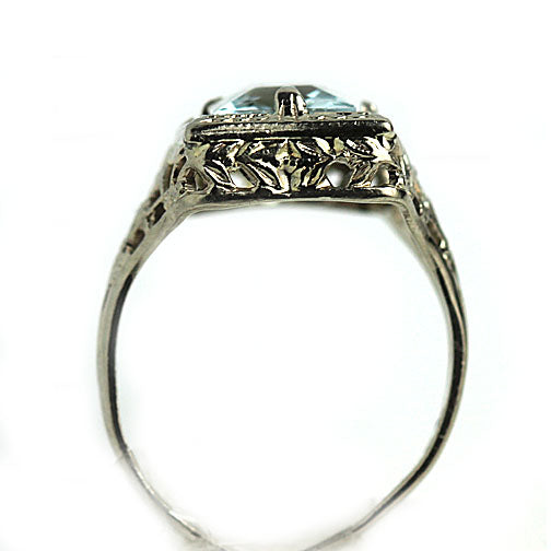 The Sari is an authentic Art Deco engagement ring circa 1930s. The ring boasts a natural placid blue 1.50 carat square cut aquamarine, residing in a square filigree frame. Crafted in 14 karat white gold, completed open with metal work and milgrain engravings. A showstopping ring, in very good condition.