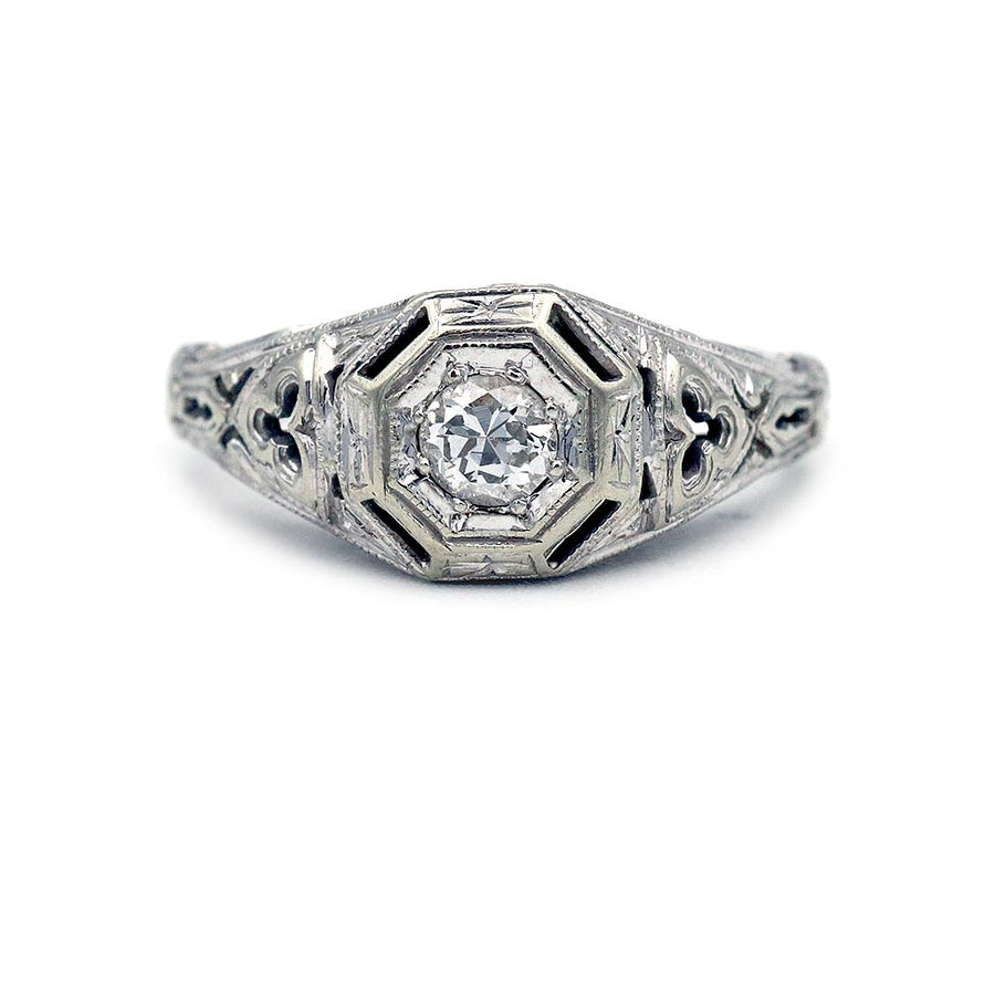 The Barrie ring is an authentic vintage engagement ring from the Art Deco era circa 1930's. The ring features a sparkling .20 carat old European cut diamond of G color, VS2 clarity, residing within a two tiered octagonal open face frame. Crafted in the 1930's in gleaming 18 karat white gold, finished with open metal work and filigree engravings. A distinctive vintage piece. As sweet as can be, in very good condition!