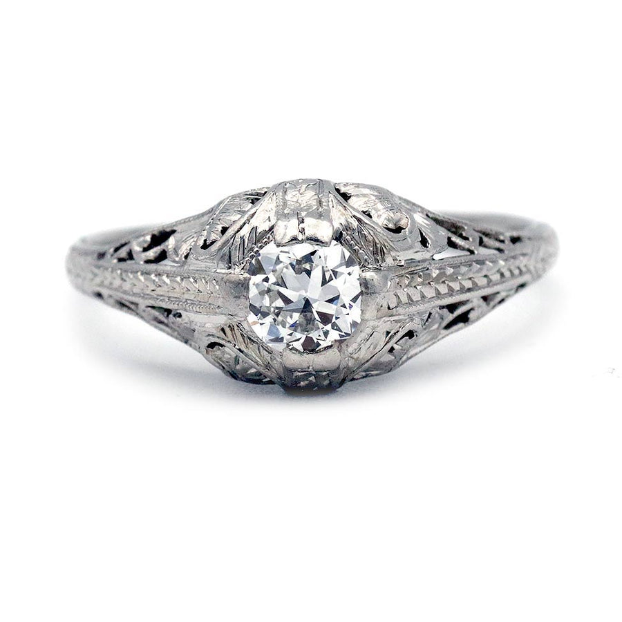 The Alexandra D ring is a rare and authentic vintage engagement ring from the Art Deco era circa 1930s. The ring features a bright-white .40 carat old European cut diamond of G color, VS2 clarity. Beautifully hand crafted in platinum, accentuated with swirls of metal work and intricate filigree engravings. A vintage treasure, in very good condition. They don't come any finer.