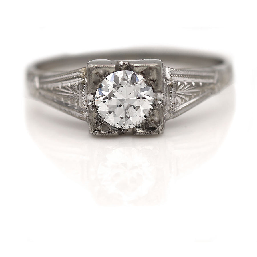 The Sarie ring is an authentic vintage engagement ring from the Art Deco era circa 1930s. The ring features a GIA certified .50 carat old European-cut diamond, residing in a geometric square frame. Crafted in the 14 karat white gold, accentuated with intricate filigree engravings. An absolutely stunning solitaire ring, in excellent condition.