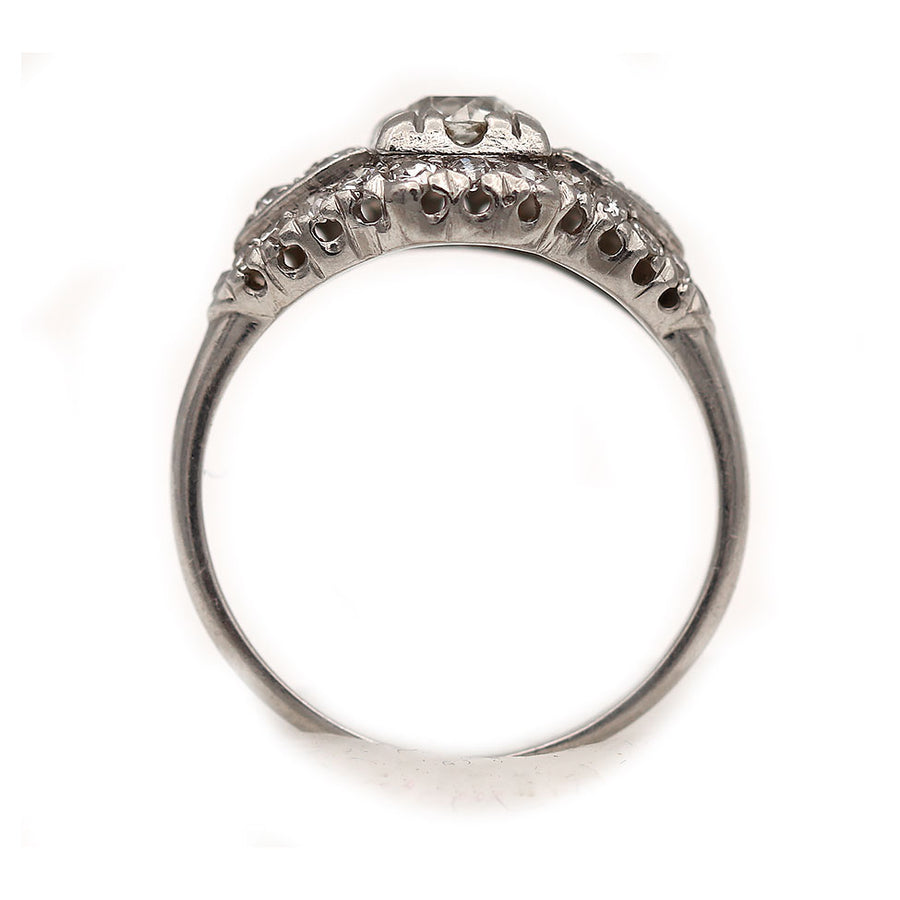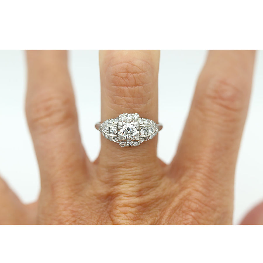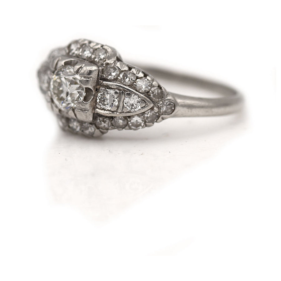 The KC ring is an authentic vintage engagement ring, circa 1940's. This ring features a .35 carat old European cut diamond of H color and VS2 clarity residing within trefoil prongs, surrounded by twenty eight (28) old European and single cut diamond accents. Crafted in platinum, this is a lovely 1940's vintage ring in very good condition.