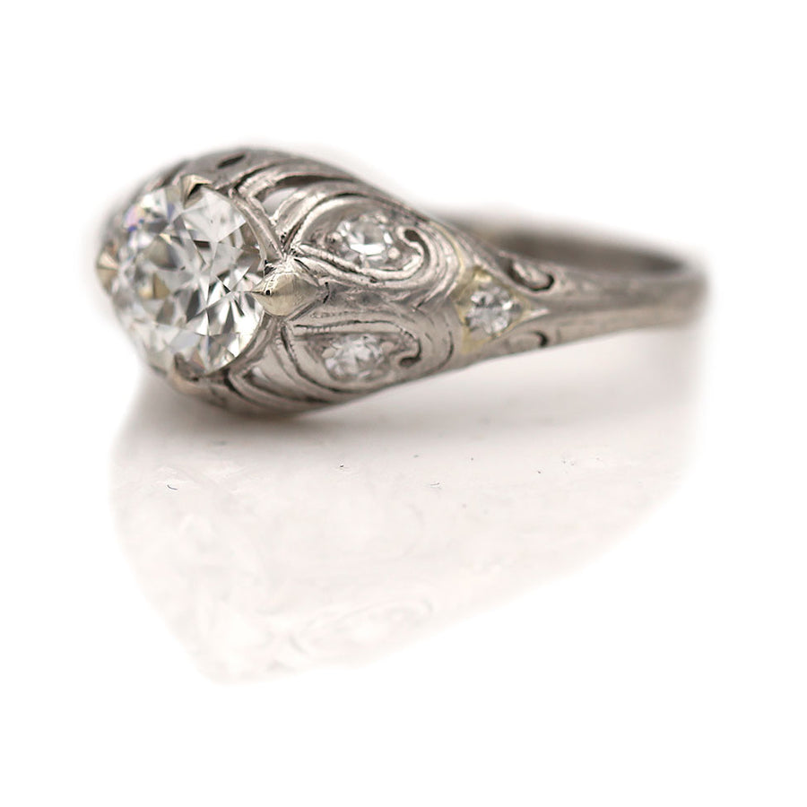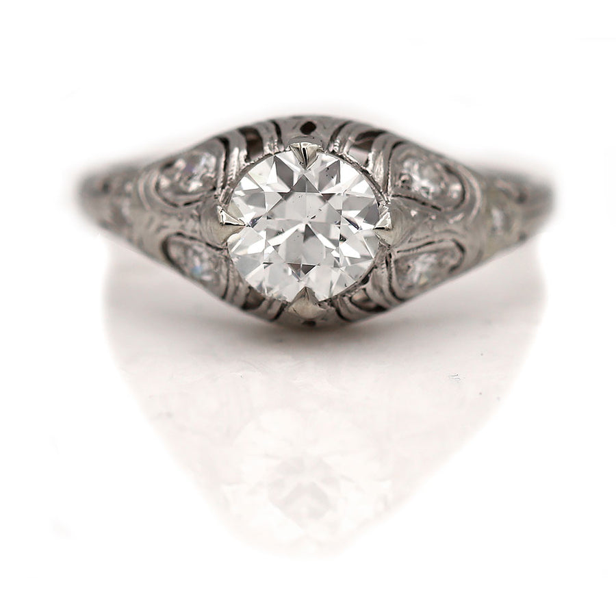 The Wanda ring is an authentic antique engagement ring from the Art Deco era circa 1930s. This ring features a dynamic .81 carat GIA old European cut diamond of I color and VS2 clarity residing within knife edge prongs and flanked by six (6) single cut diamond accents. Beautifully crafted in the 1930's in platinum, accentuated with open metal work and filigree engravings. A stunning ring that is in very good condition.