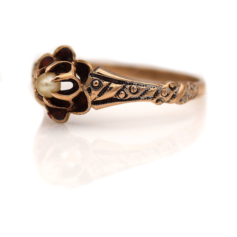 The Bindy ring is a delicate 1900's Victorian solitaire engagement ring features one (1) cultured pearl, residing within a six (6) prong buttercup setting. Beautifully crafted in 10 kt rosy yellow gold and accentuated with delicate filigree engravings. This ring measures 8.0 mm, tapering to 4.5 and .09 thick at the base of the shank. As sweet and lovely as can be. In very good condition.