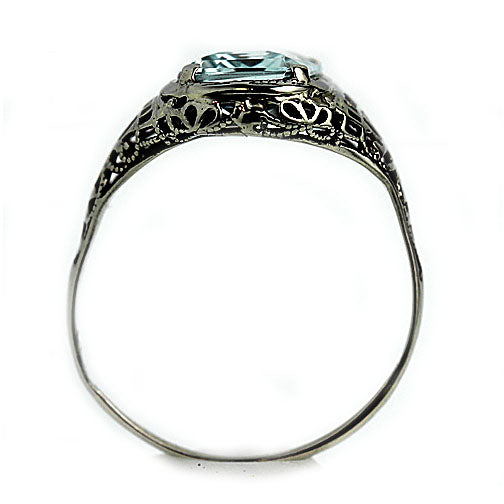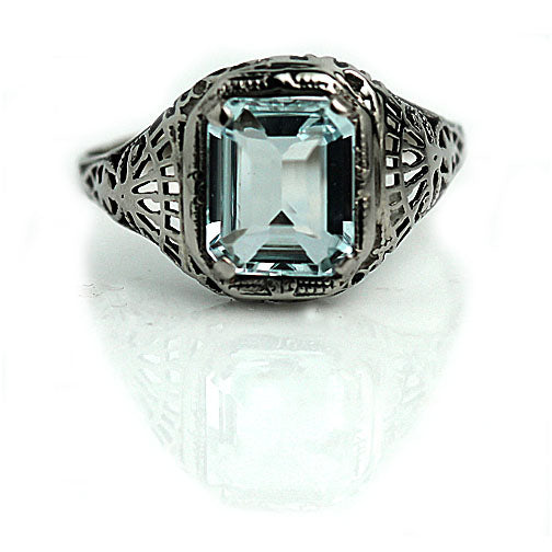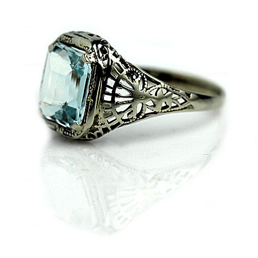 The Windy ring is an authentic Art Deco engagement ring circa 1930's. The gemstone ring features a natural placid blue 2.20 carat emerald cut aquamarine. Crafted in 14 karat white gold, completed with open metal work and filigree engravings. A lovely vintage piece, in good condition.