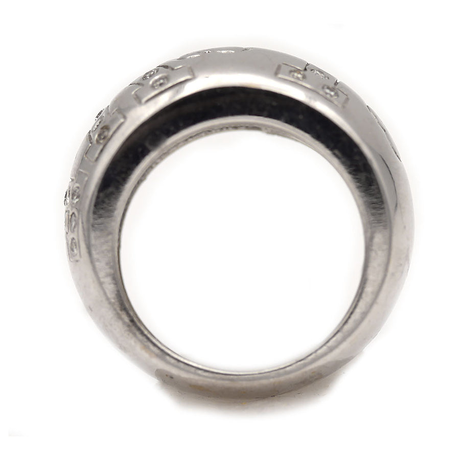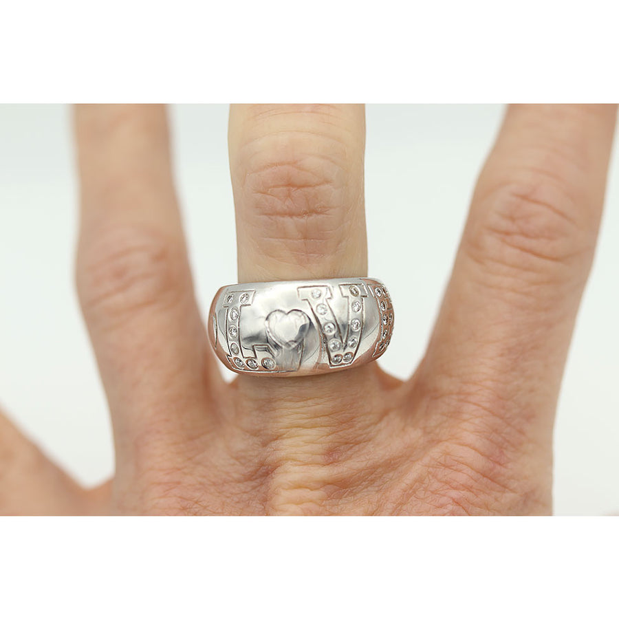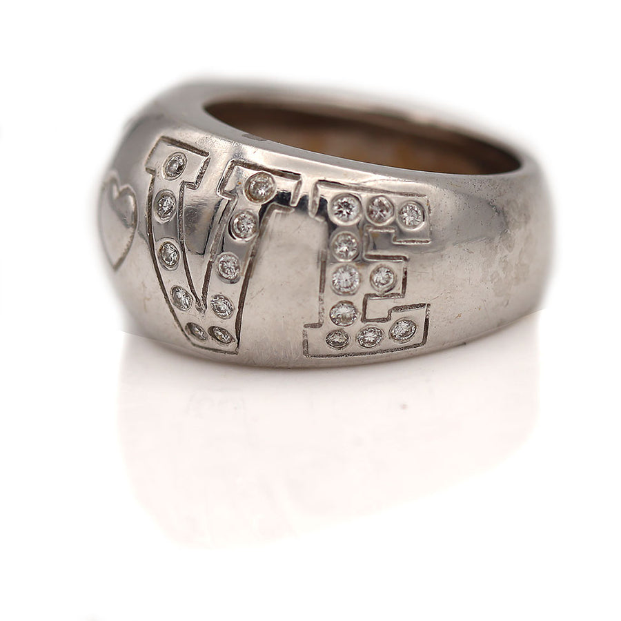 This fantastic estate replica of the popular Cartier love diamond ring contains 28 round diamonds, weighing approximately 0.30 carats. This fun love replica is crafted in 14 kt white gold and is size 5 1/2.