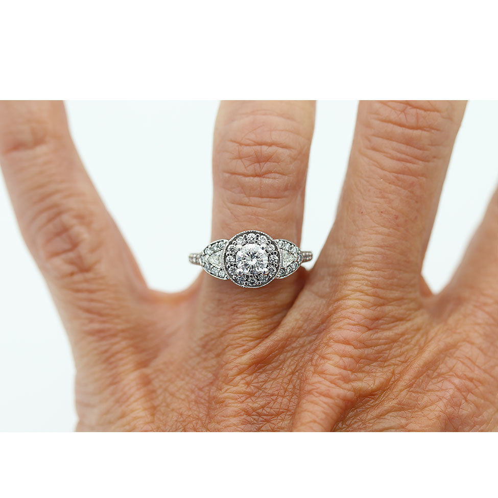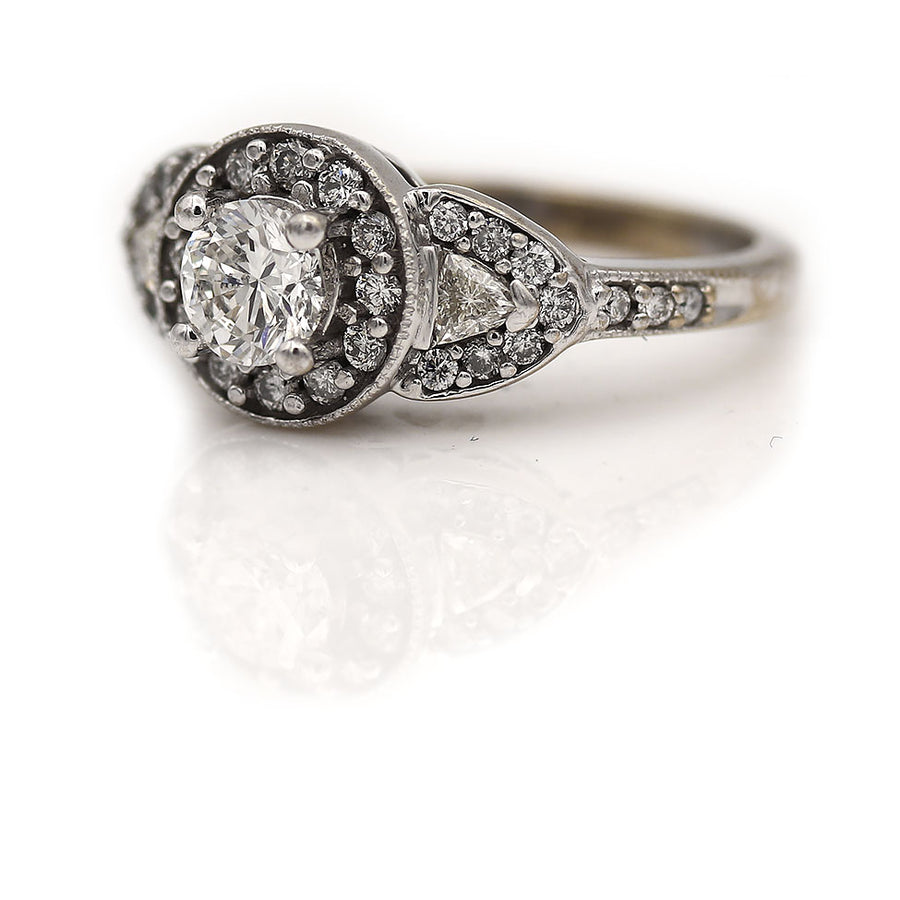 The Ruthie ring is an authentic vintage diamond engagement ring circa 2000. The ring features a glittering .55 carat AGI certified round diamond of F color, SI2 clarity. The diamond is flanked by 2 trillion cut diamonds and a beautiful halo of 34 pave set round cut diamond accents. Crafted in 14 karat white gold, accentuated with milgrain engravings. A clean, crisp showstopping ring. In very good condition.