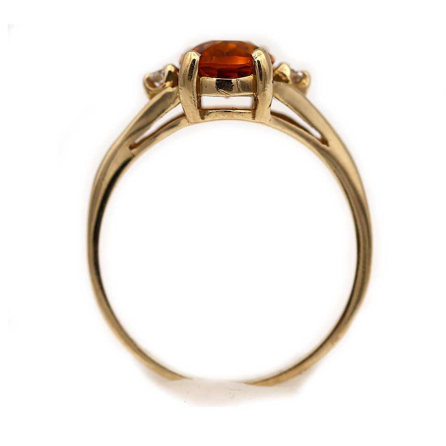 The Tierney S ring is an authentic vintage citrine ring, circa 1970s. This ring features a 1.50 carat vintage natural intense orange citrine, flanked by two (2) round cut diamond accents. Beautifully crafted in 14 kt yellow gold, this is a lovely gemstone ring. Perfect to wear on either hand! In very good condition.