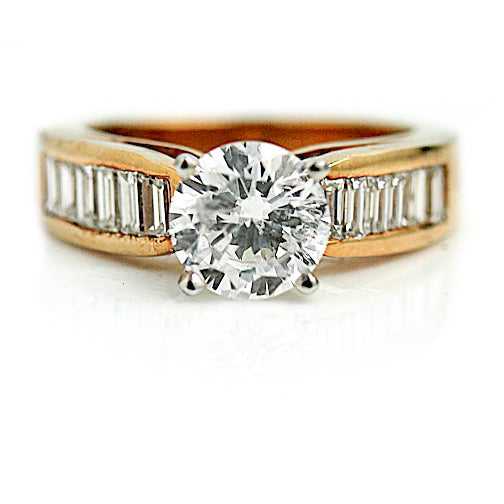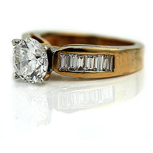 The Sherri ring is an authentic vintage diamond engagement ring circa 1970's. The ring features a bright-white 1.40 carat GIA certified diamond of K color, I1 clarity (has a tiny lazer). The diamond is flanked by 12 channel set straight baguette diamond accents. Beautifully crafted in gleaming 14 karat yellow gold. A classic and timeless piece. In very good condition.