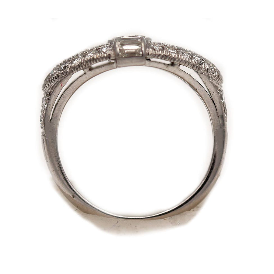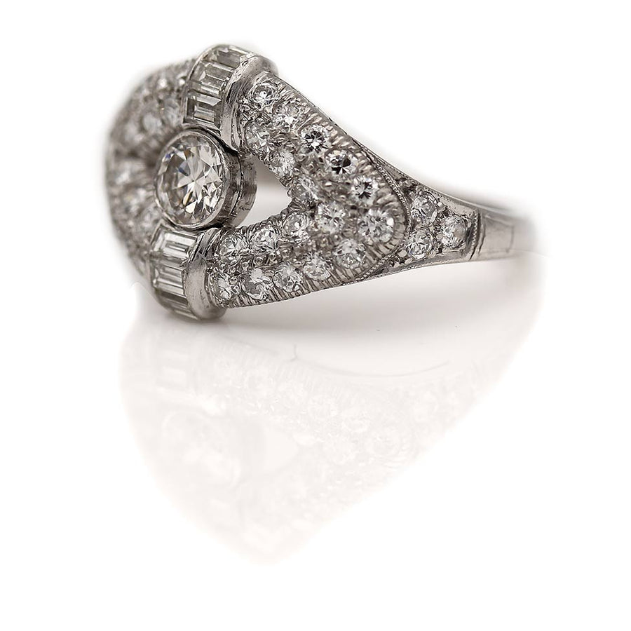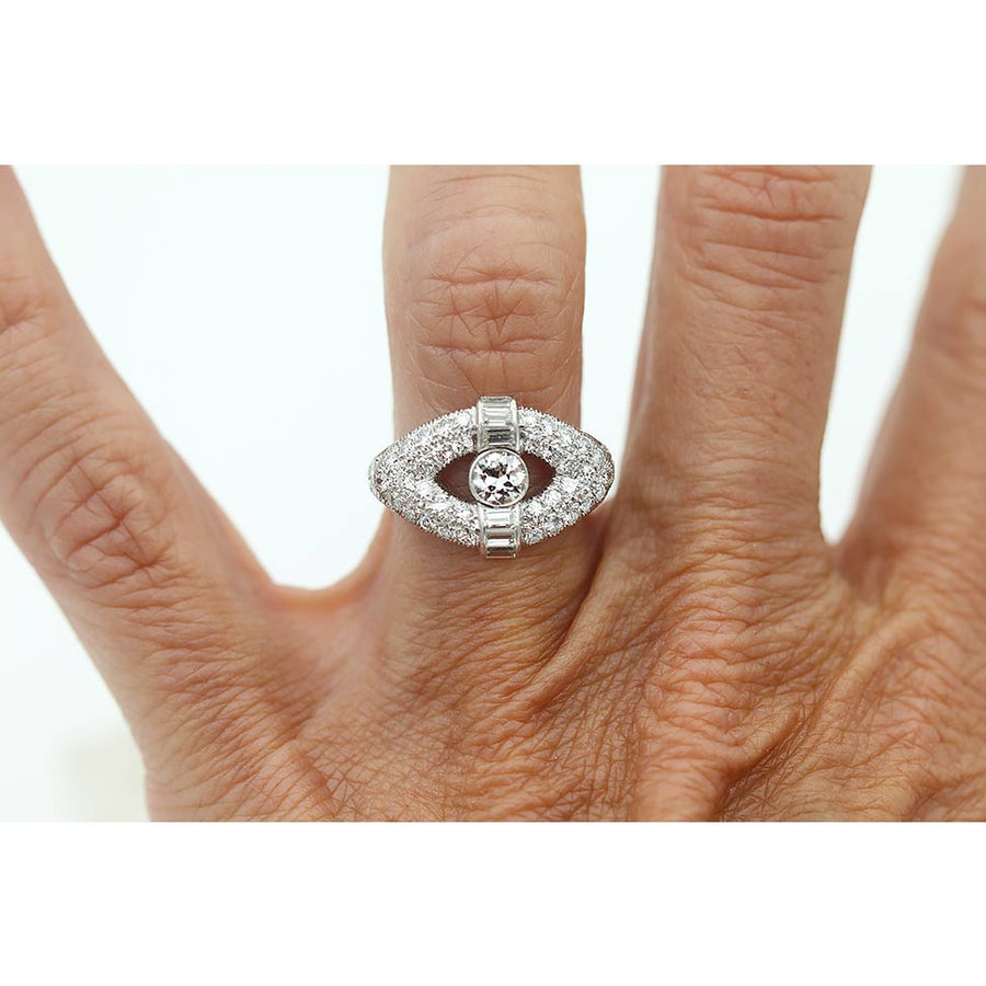 The Jacinda ring is an authentic vintage diamond engagement ring circa 1960's. The ring features a bezel set .35 carat old European cut diamond of F color and VS2 clarity. The diamond is surrounded by 6 north- south channel set baguette cut diamonds and 54 glittering pave set old European cut diamond accents. Beautifully crafted in platinum. A cool, dynamic ring that will spread the finger beautifully. This showstopping ring is perfect to wear on either hand and is in very good condition.