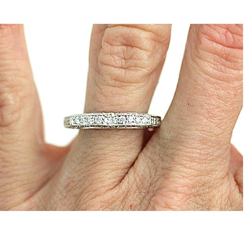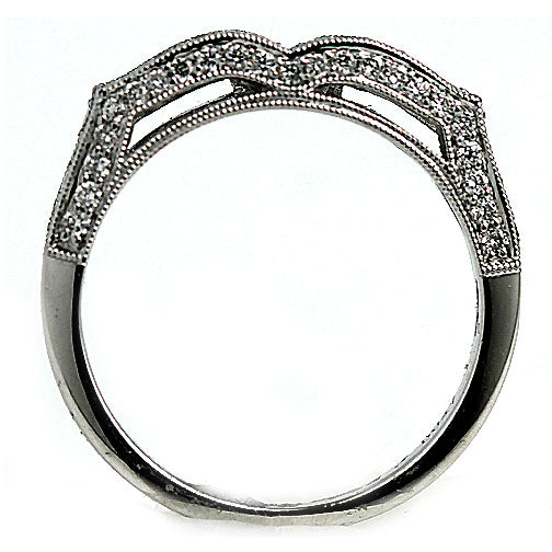 Katie P is guaranteed to add a little zest to your vintage engagement ring! This vintage style contoured wedding band, features 54 glittering round diamonds weighing .50 carat (G color and VS2 clarity). Crafted in the 1990's in 18 kt white gold and finished with milgrain engravings. The perfect match for your engagement ring! In excellent condition.