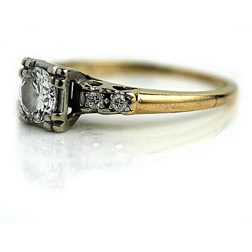 The Nikola ring is an authentic vintage diamond engagement ring circa 1940s. The ring features a high-quality .55 carat old European-cut diamond of H color, VS2 clarity, residing in a square frame with trefoil prongs. The diamond is flanked by 4 transitional cut diamonds. Crafted in gleaming 14 karat white gold atop a 14 karat yellow gold ring. We love the combination of white and yellow gold. A classic piece, in very good condition.