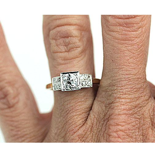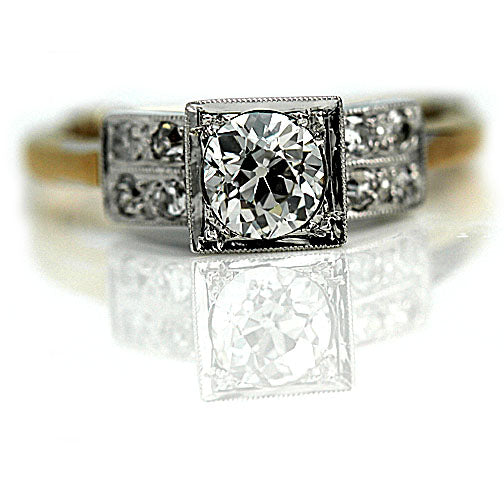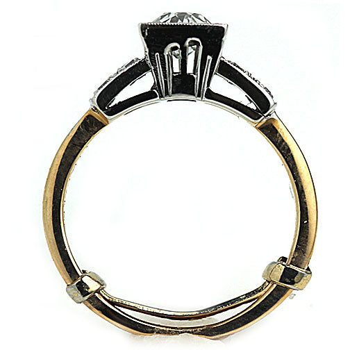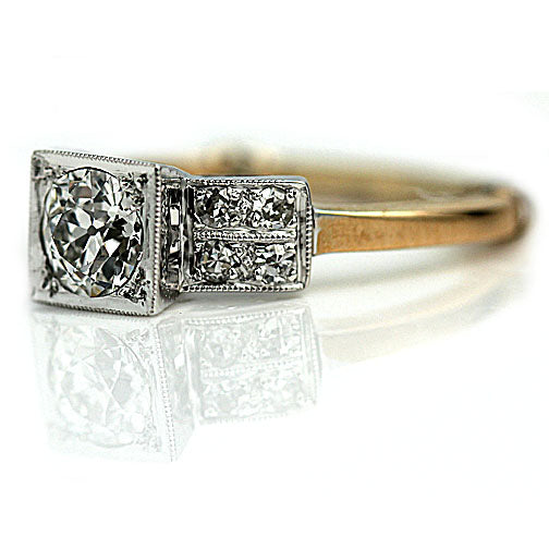 The Carrie ring is an authentic vintage engagement ring from the 1940s. The ring boasts a GIA certified .51 carat old European cut diamond residing in a geometric square milgrain frame, flanked by a double row of 8 single cut diamonds accents. Crafted in palladium and 14 karat yellow gold. In very good condition.