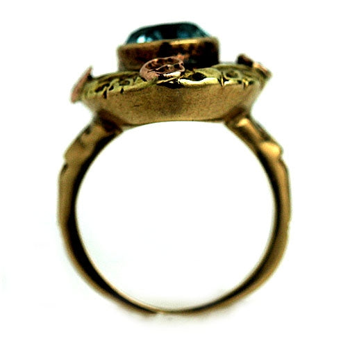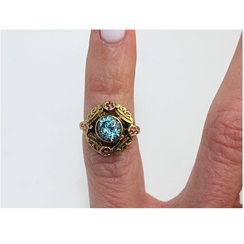 The Emilia ring is an authentic vintage engagement ring circa 1940's. This floral rose gold zircon engagement ring ring centers a natural electric blue .90 carat zircon. Crafted in 14 Kt rose and yellow gold, and completed with intricate rose and yellow gold floral petals. Delicate engravings complete the ring. Perfect to wear on either hand, in very good condition.